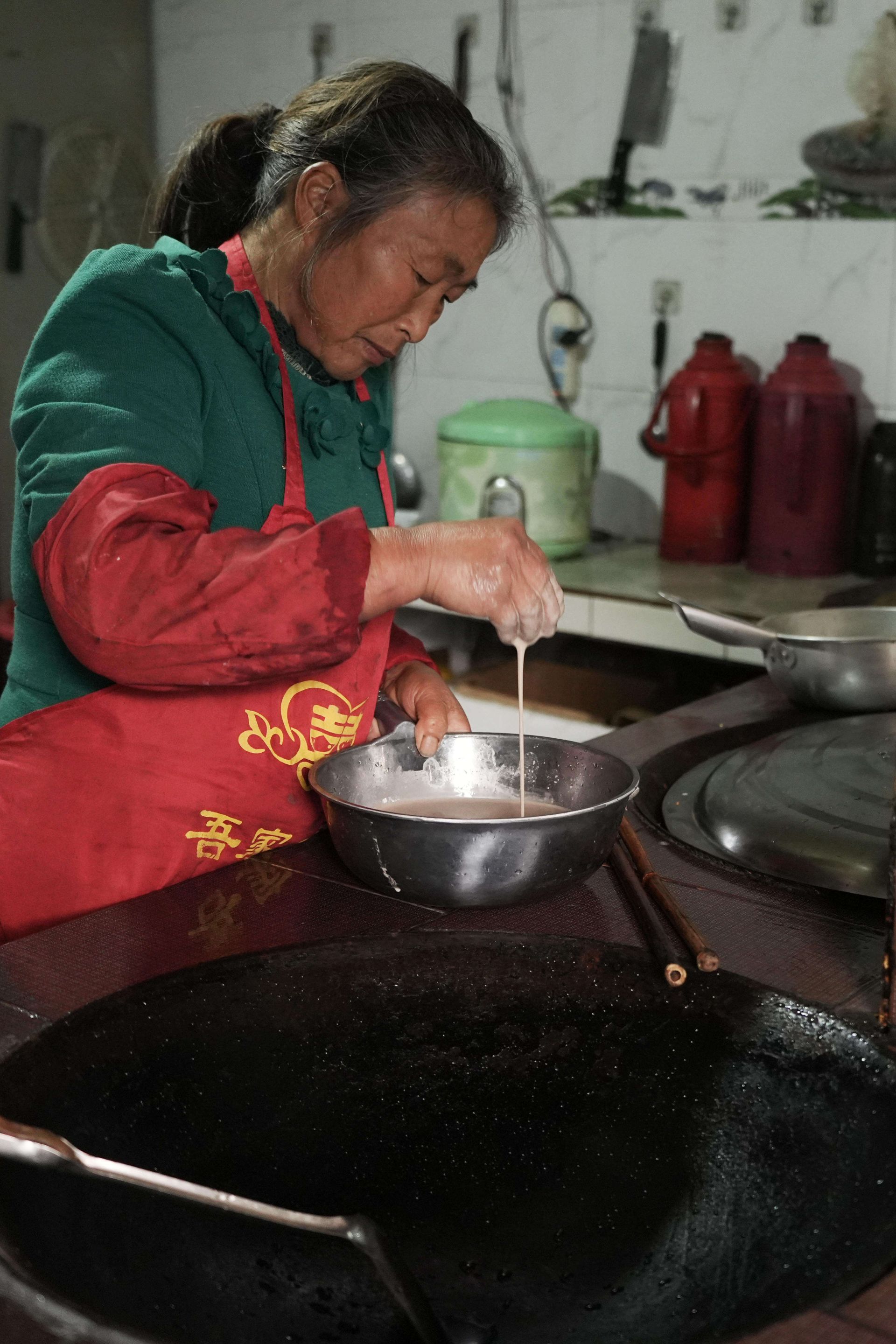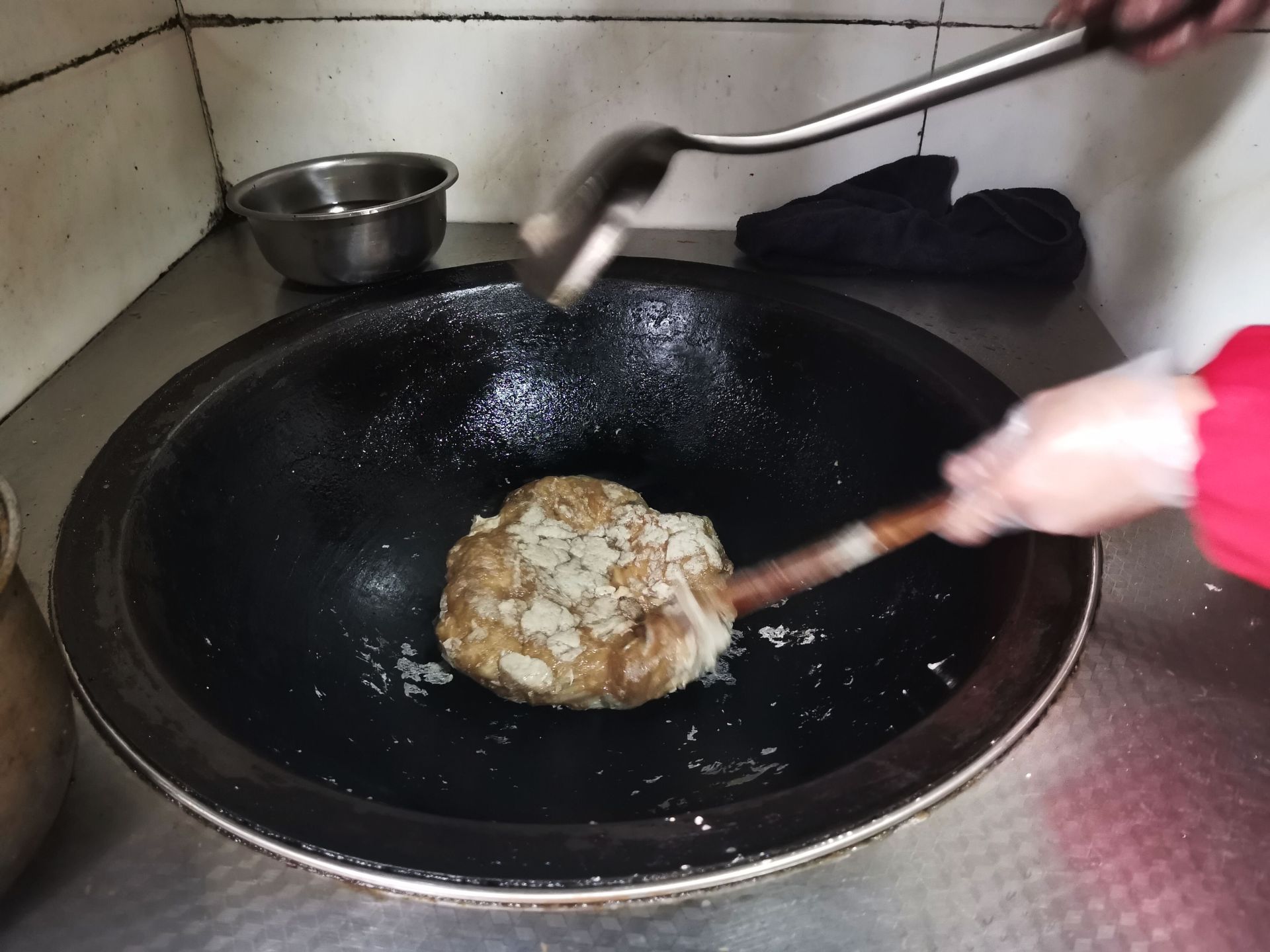 把蕨粉烙成蕨粑,主要由陈国轩来完成。“看起来简单,做好却很难。”陈国轩一边操作,一边介绍:灶火烧大了,要糊;小了,又熟不透。“我们团转有好几户,把蕨根变成了蕨粉,但在最后一关都失败了。”初学的时候,陈国轩也有不成功的时候,现在却成了远近闻名的师傅。