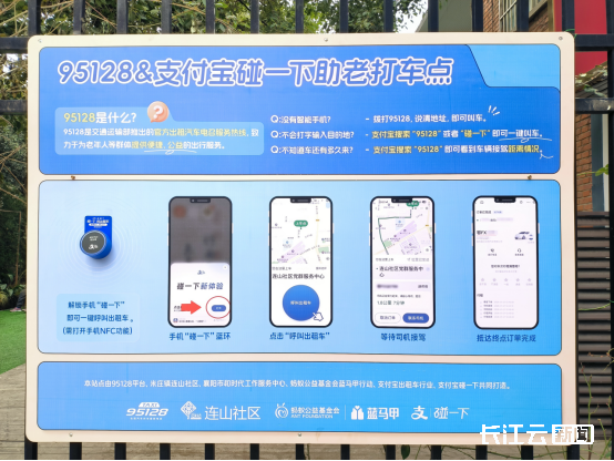 启动仪式后,蓝马甲志愿者带老年人体验95128叫车服务,连山社区徐阿姨反馈“不用找到打车软件再输入起点终点,轻轻碰一下就能叫车,还能在支付宝上看到车辆信息,太方便了!”细心的志愿者还帮徐阿姨把95128存进了手机通讯录,如找不到“碰一下”线圈,还能直接拨打电话叫车。