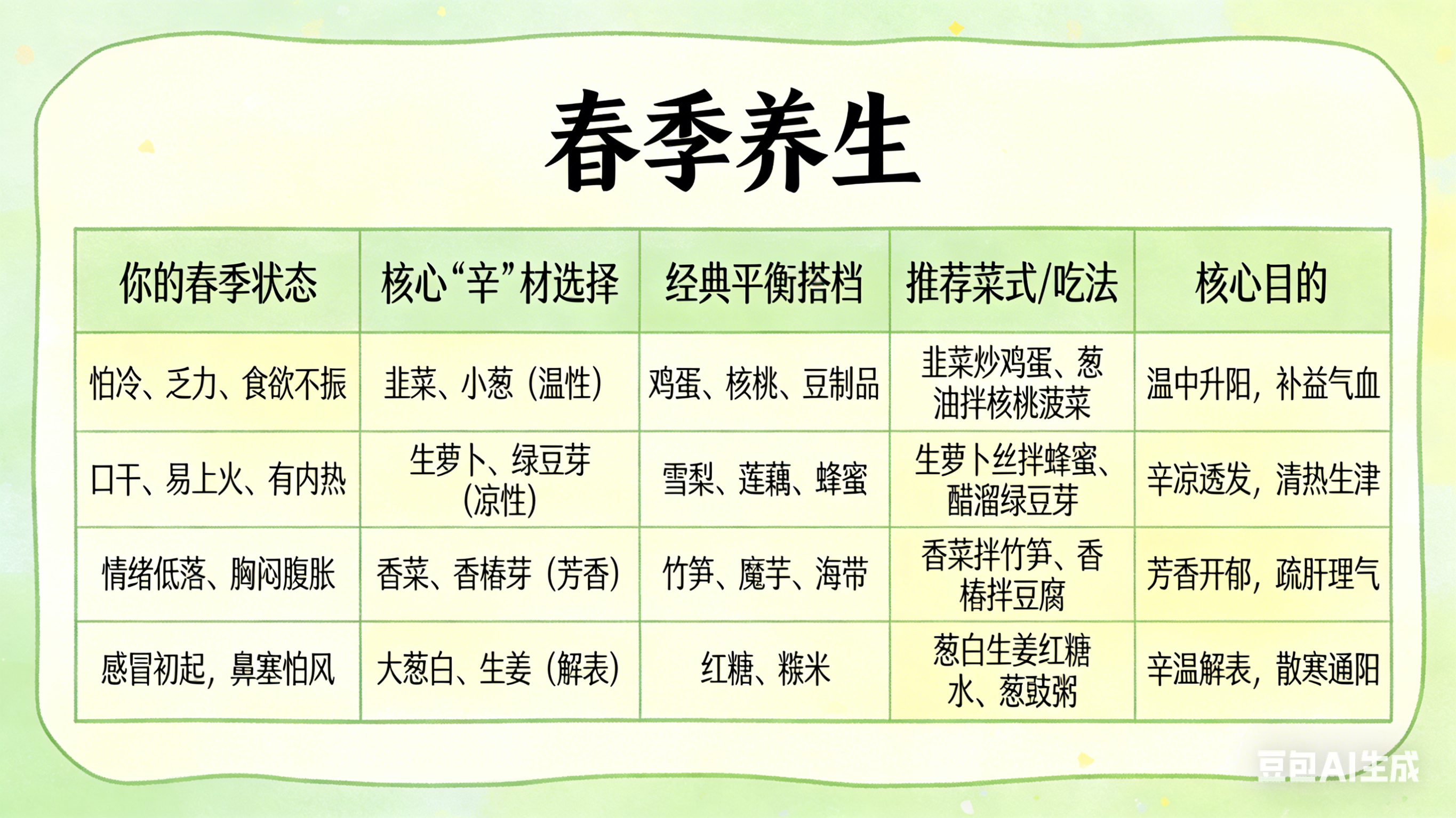 特别注意:如果你是阴虚火旺(常年口干舌燥、手足心热)或湿热内蕴(面部油腻、大便黏腻)的体质,春季阳气本就易亢,吃辛更要谨慎,浅尝辄止,并多搭配凉润食材。