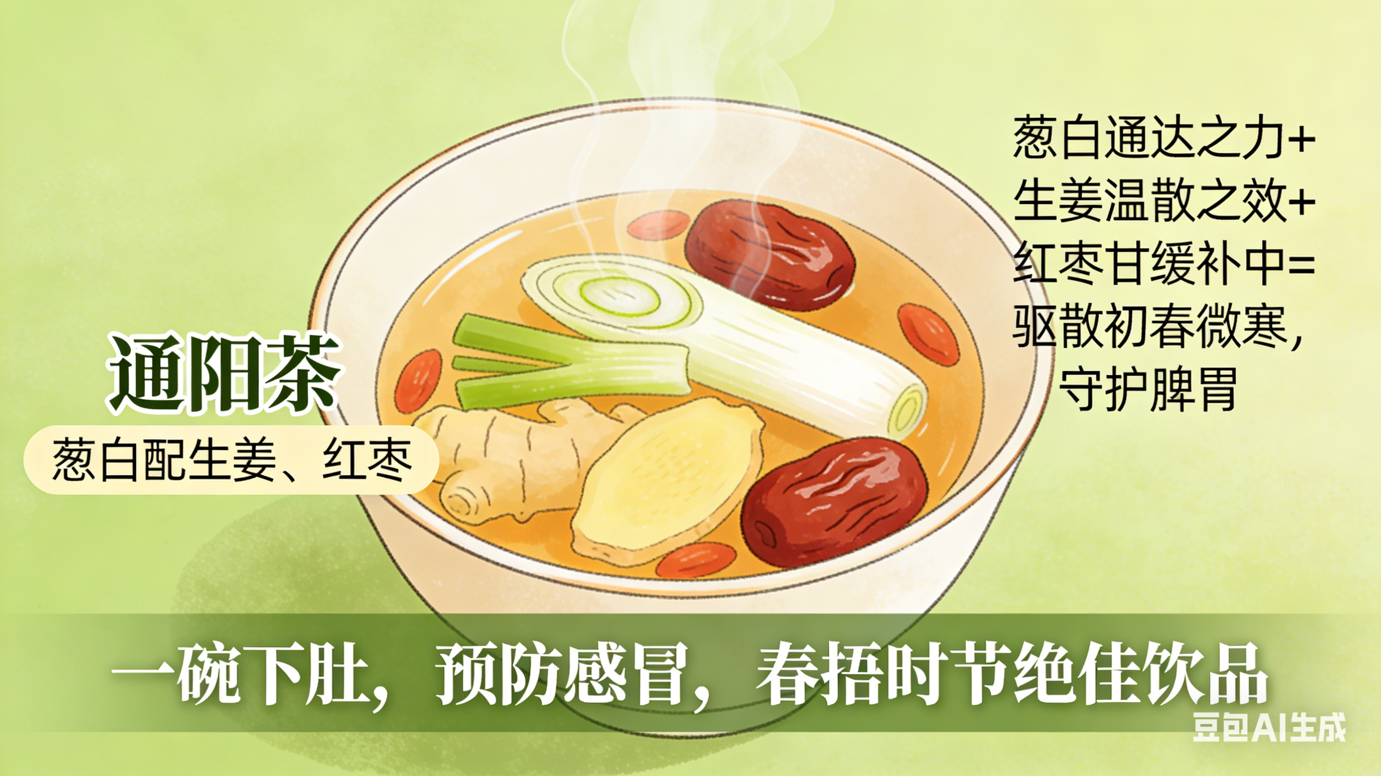 取葱白的通达之力,生姜的温散之效,再佐以红枣的甘缓补中,驱散初春的微寒,守护脾胃。一碗下肚,预防感冒,正是“春捂”时节的绝佳饮品。