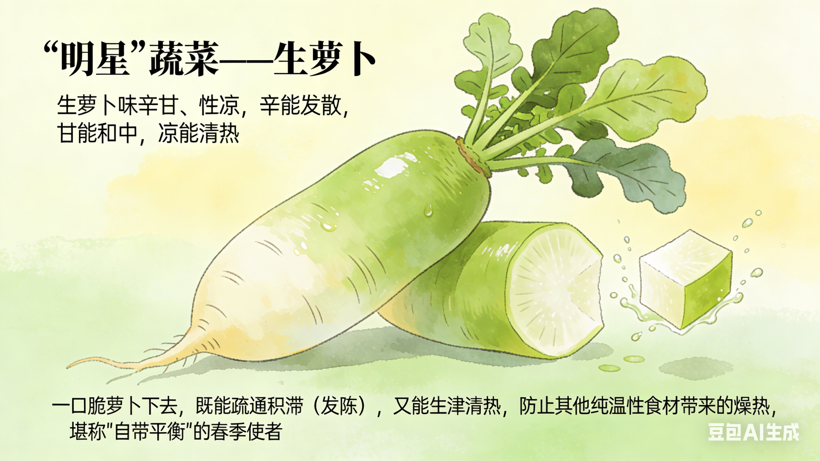 生萝卜味辛甘、性凉,辛能发散,甘能和中,凉能清热。一口脆萝卜下去,既能疏通积滞,又能生津清热,防止其他纯温性食材带来的燥热,堪称“自带平衡”的春季使者。