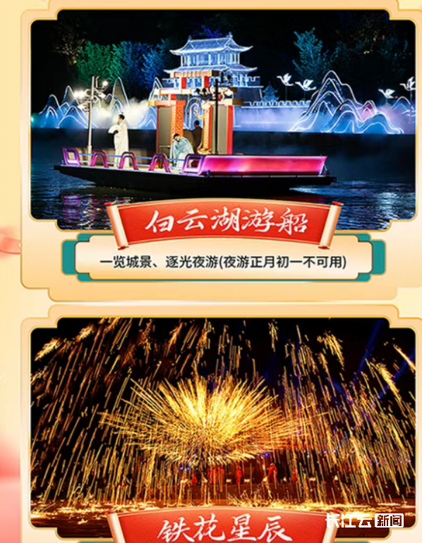 2月18日—2月23日(初二至初七),白云湖游船推出非遗打铁花+火壶表演,漫天铁花如星辰坠落,搭配逐光夜游的城景,视觉冲击感十足!温馨提示:该项目超火爆,每日预约上限仅80人。