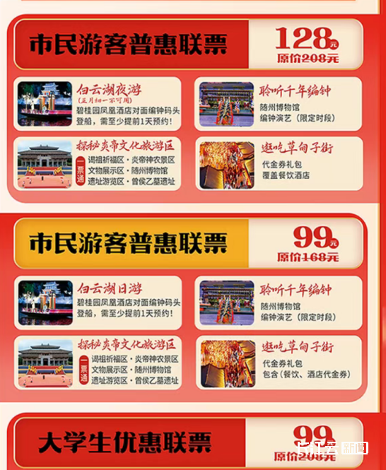 128元市民游客普惠联票(原价208元):含白云湖夜游、随州博物馆编钟演艺、炎帝文化旅游区、草甸子街、曾侯乙墓遗址,还送餐饮酒店代金券礼包(正月初一夜游不可用,登船需提前1天预约)。