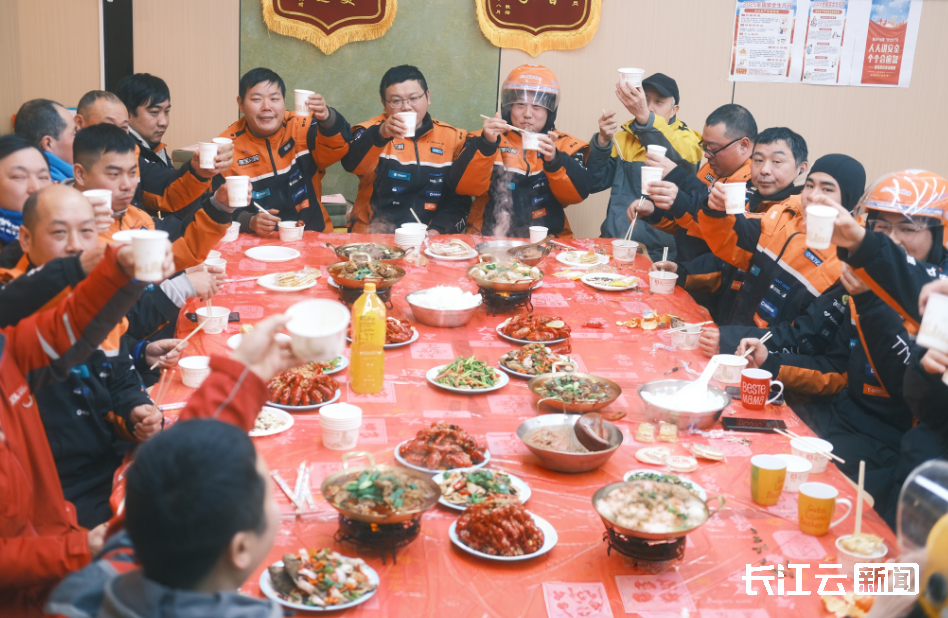2月3日,武汉南湖街道华锦社区幸福食堂里暖意洋洋,红油鲜亮的潜江龙虾摆上餐桌,20余名快递小哥、外卖骑手们围坐在一起,热热闹闹地吃上了一顿暖心团年饭。
