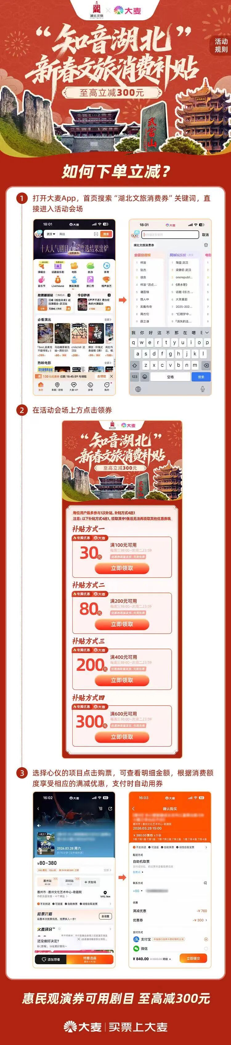 活动期间,消费者可通过在大麦App或大麦微信小程序,搜索“湖北文旅消费补贴”或在首页相关广告位点击进入消费补贴专属活动页面,点击领券后,进入商品详情页面选座购买补贴商品,并在购票结算阶段享受补贴优惠。