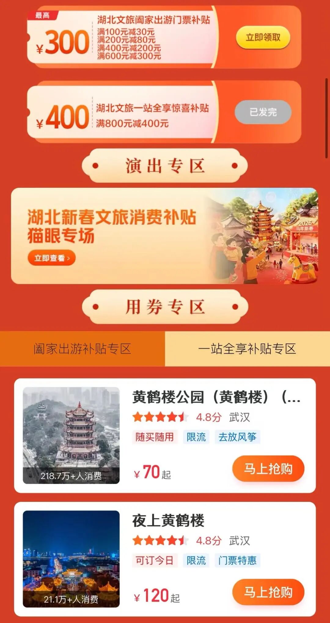 “知音湖北”新春文旅消费补贴