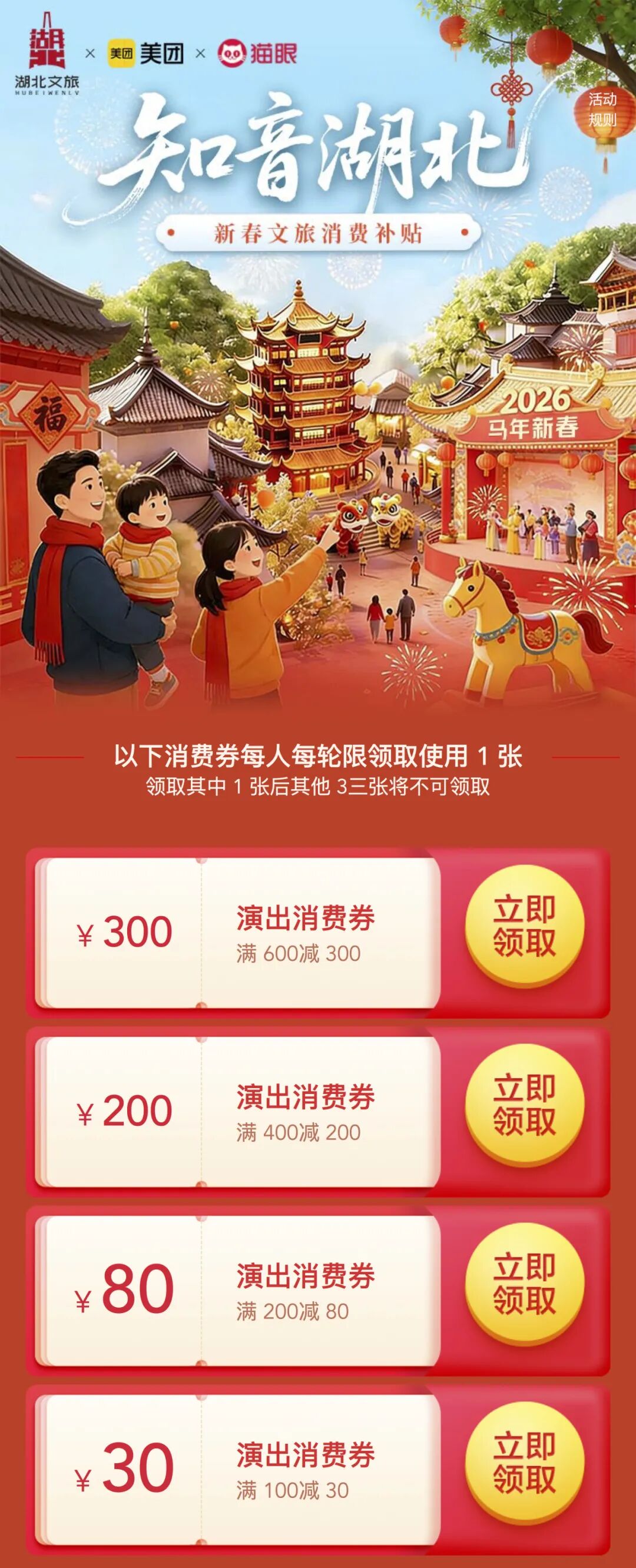 活动期间,全国消费者可通过在美团App或大众点评APP,搜索“知音湖北”跳转新春文旅消费补贴主会场,点击领券后,即可进入商品详情页面购买补贴商品,并在购票结算阶段享受补贴优惠。