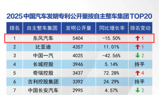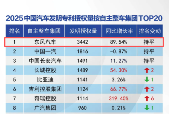 近日,中汽信科发布的《2025年中国汽车专利数据统计研究报告》数据显示,2025年,东风汽车发明专利授权量达3442件,连续四年稳居中国自主整车集团首位;发明专利公开量5404件,同样位列第一。与此同时,在智能网联领域,东风汽车以2049件有效专利高居自主整车集团榜首,以持续稳定、高质量的创新产出能力,展现了汽车“国家队”在关键核心技术自主可控道路上的担当与作为。