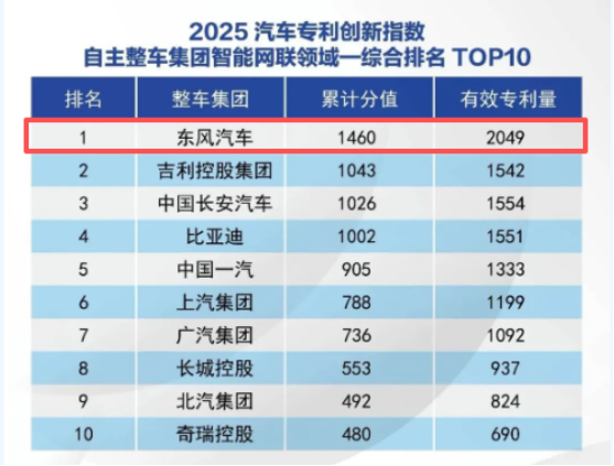 东风汽车在智能网联领域专利创新指数位列自主整车集团第一