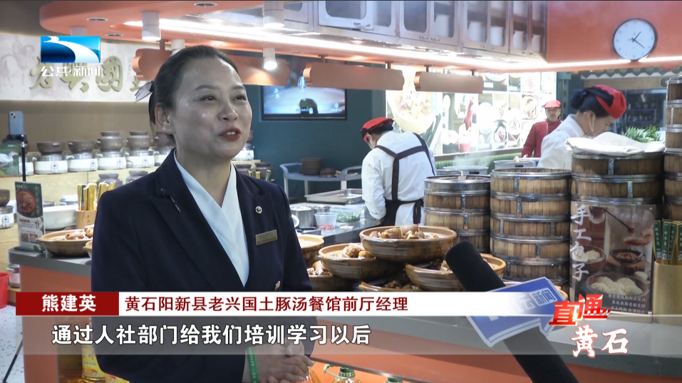 黄石市阳新县老兴国土豚汤餐馆前厅经理 熊建英:通过人社部门给我们培训学习以后,我们学会了视频的拍摄和剪辑,学会了直播,直播每天给我们带来10单左右的订单。