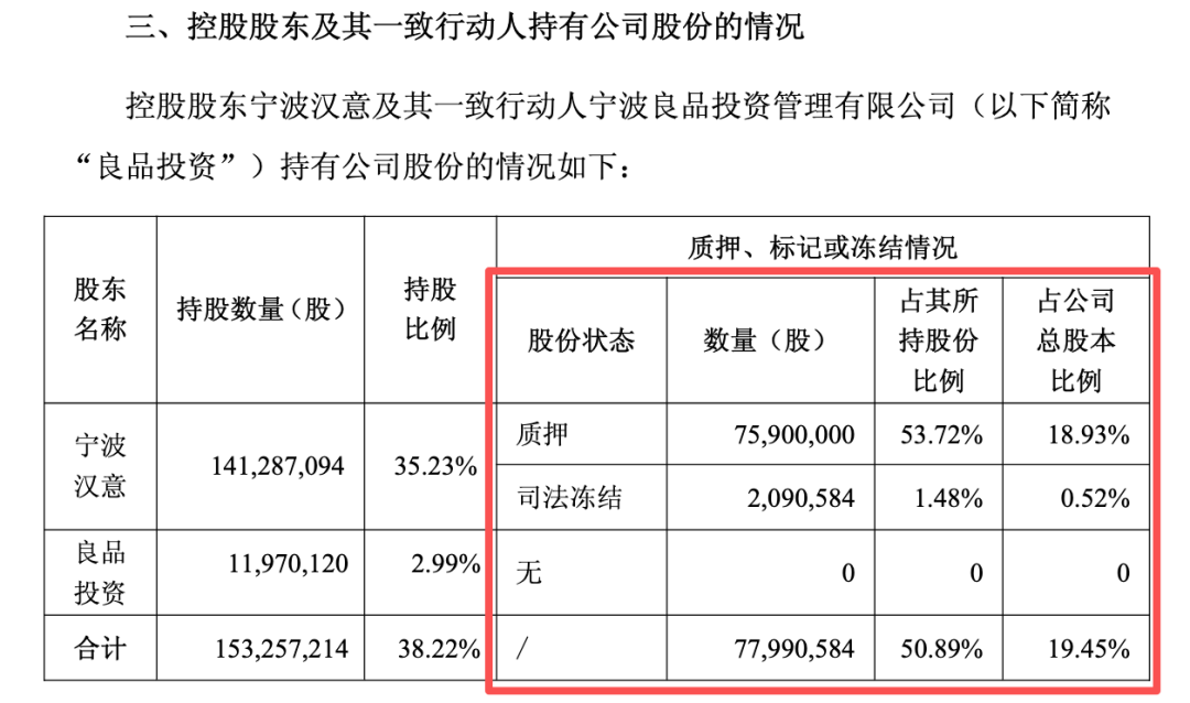 但截至公告日,宁波汉意所持股份中,累计质押7590万股(占其所持股份的53.72%),另有209.06万股被司法冻结(占其所持股份的1.48%),质押及冻结股份合计占公司总股本的19.45%。
