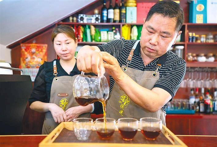“自强哥”李长建,早年在国外打拼,2019年回到堰河。他发现游客越来越多,却少一个能安静歇脚的地方,于是把自家小院改造成了全村第一家咖啡馆——“堰河味道”。他独创的“茶咖”,把本地高香茶和咖啡巧妙融合,成了网红产品。他的咖啡馆吧台也成了直播间,去年帮乡亲们卖了近300万元的土特产。
