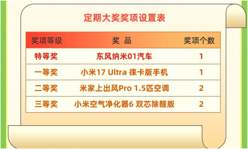 第二种方式就是定期抽奖,分三期进行。首期开奖范围为1月24日至2月2日开具的发票,第二次为2月3日至3月3日开具的发票,第三次为3月4日至3月31日之间开具的发票。参与过即开即奖的合格发票,可以参与抽取定期大奖,每期设有4个奖项等级,特等奖是东风纳米01汽车。”