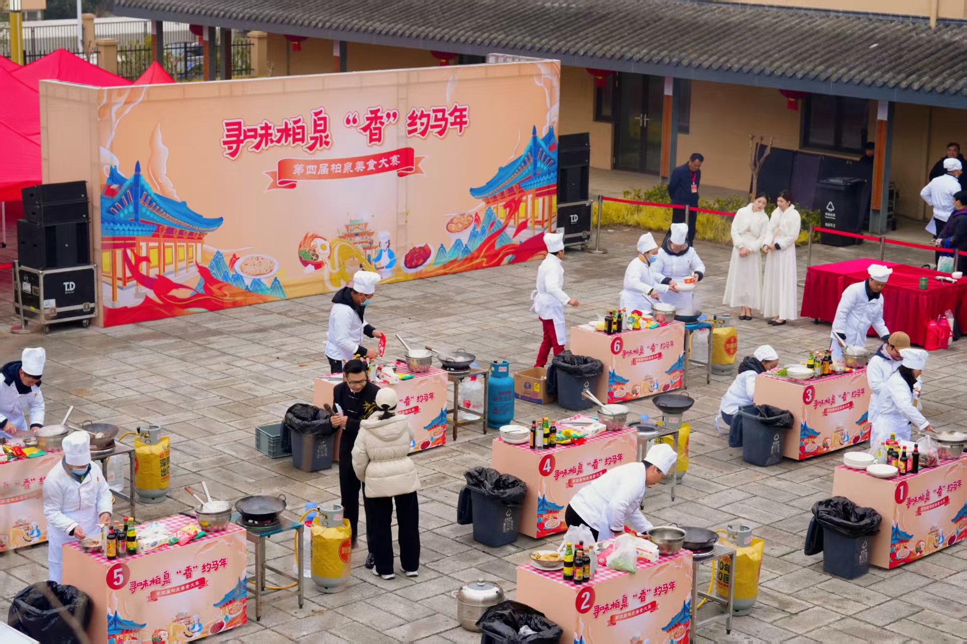活动现场,精彩节目轮番上演,好戏连台不间断。文旅推介引人入胜,带现场观众领略异地风土人情;本土非遗表演惊艳亮相,用匠心技艺诠释传统文化魅力。现场特别增设传统美食大赛环节,柏泉十大名菜悉数登场,参赛选手各展绝技、匠心烹制,阵阵香气弥漫整个古街。评委现场品鉴打分,游客则近距离观摩美食制作过程,免费品尝特色美味,沉浸式感受舌尖上的新春年味,为开幕式增添了最质朴动人的烟火气息。