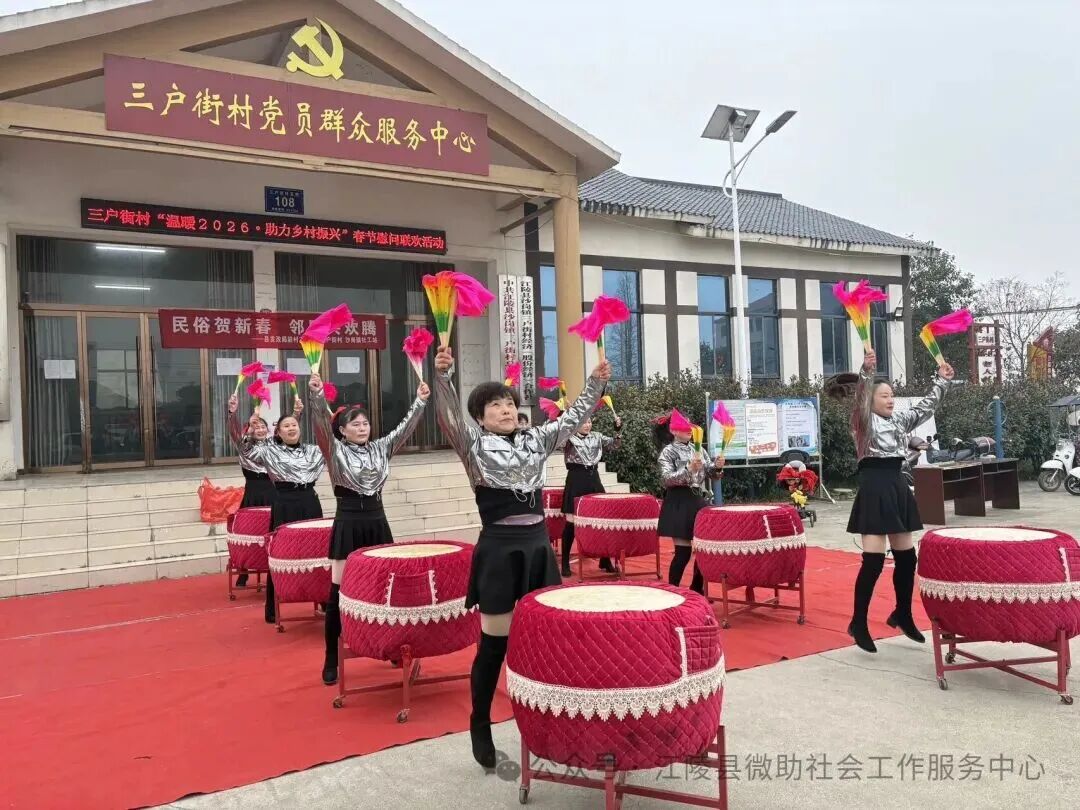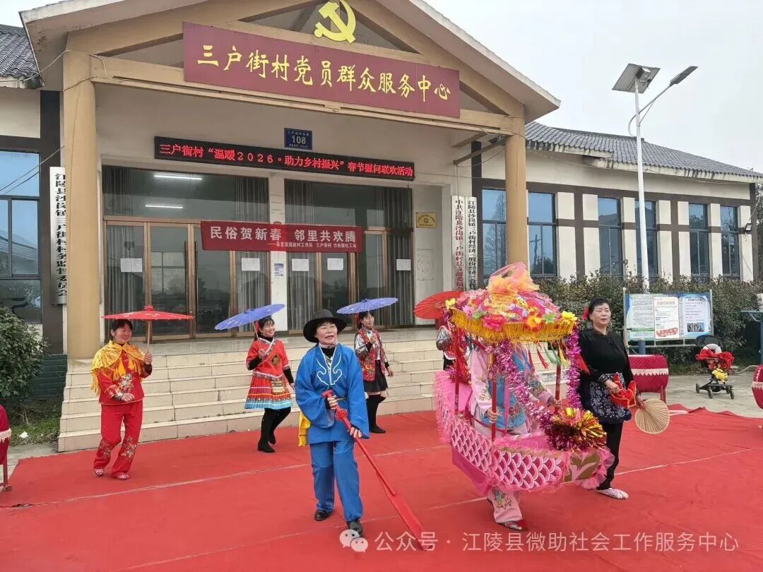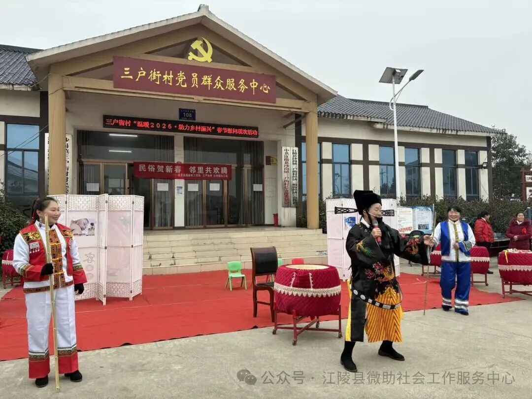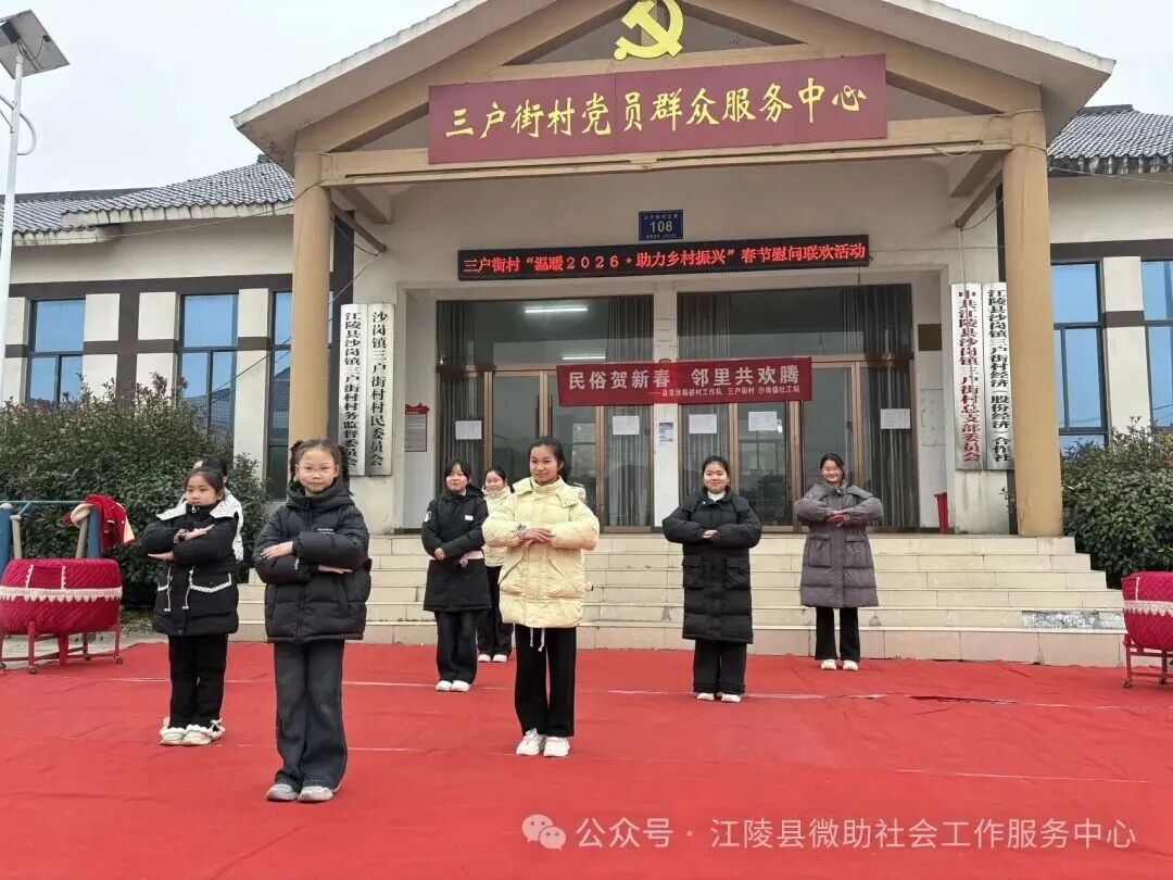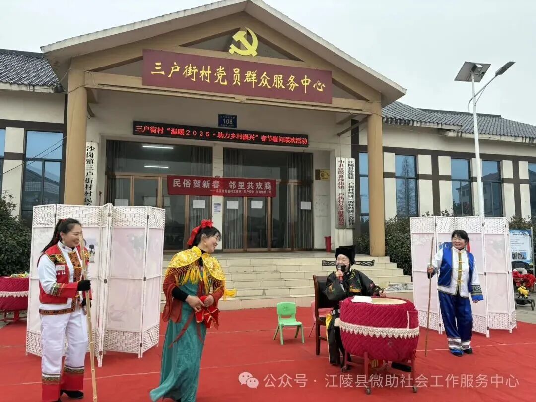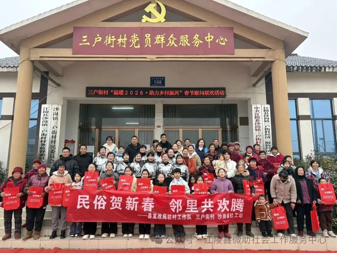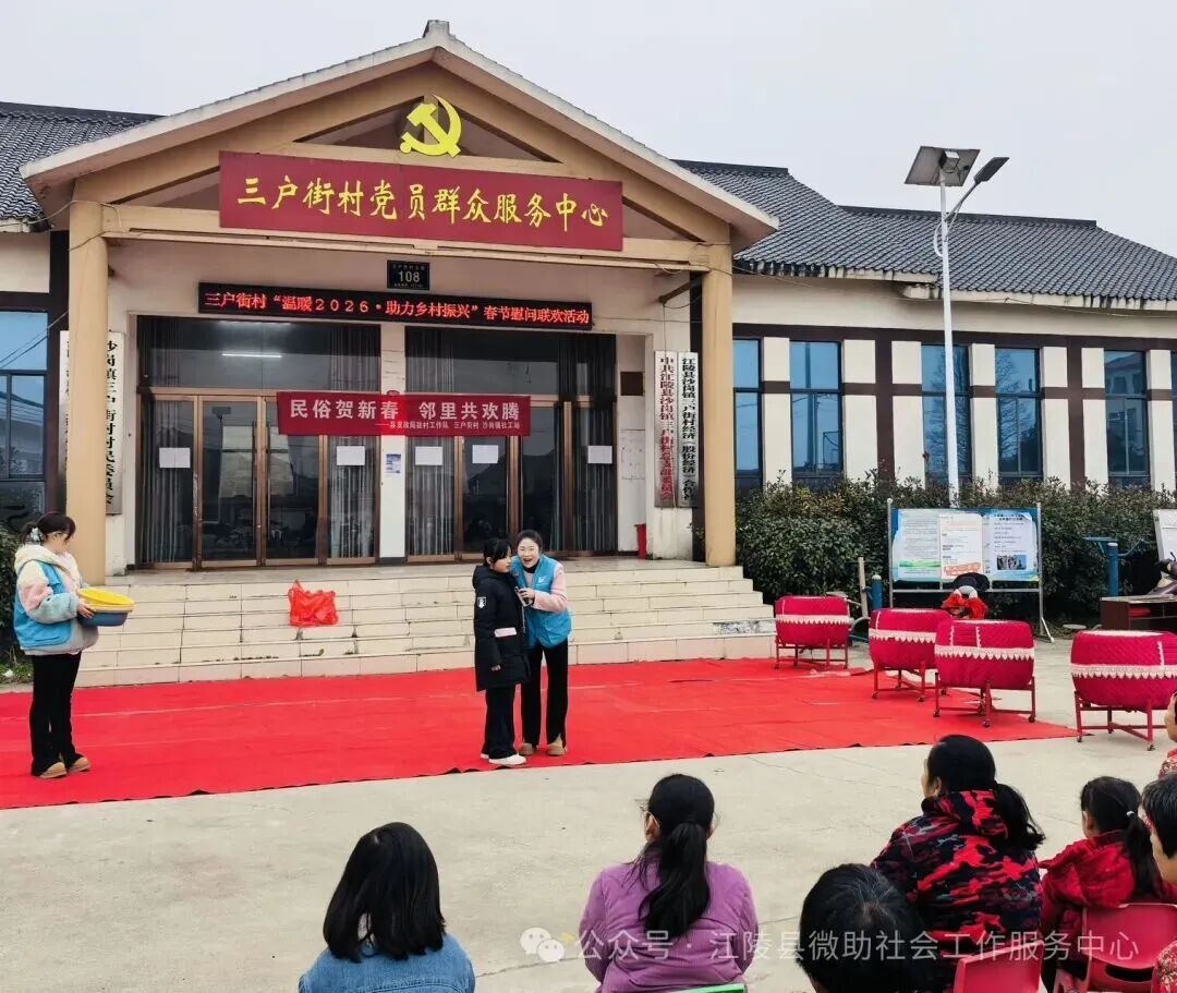 2月4日立春当天,湖北荆州市江陵县沙岗镇三户街村村委会广场热闹非凡,一场“民俗贺新春 邻里共欢腾”为主题联欢会在此举行。此次活动由县委社会工作部、沙岗镇、县发改局等部门指导,微助社工驻沙岗镇社工站联合三户街村党支部共同举办。村支书杨传俊与县发改局驻村组长尹官海登台致辞,为村民送上新春祝福。