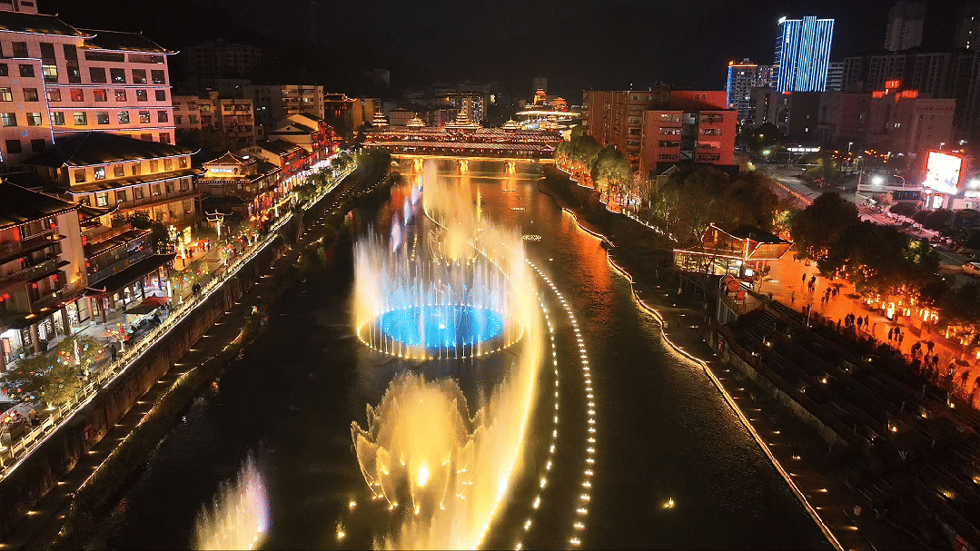 墨达楼的全景亮化、贡水河的水幕电影