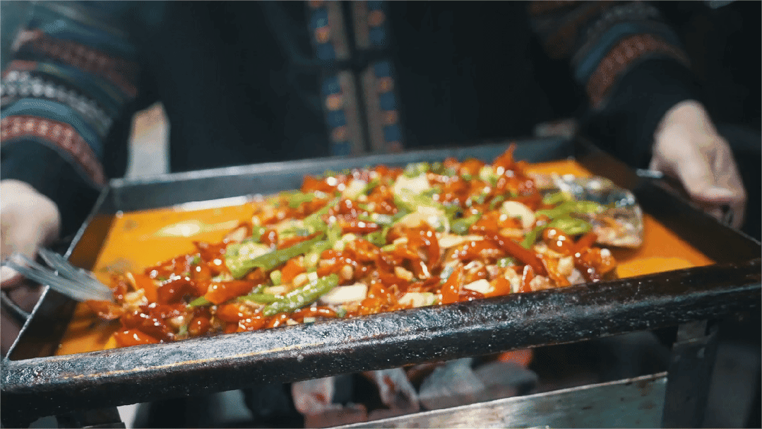 惹溪街烤活鱼香伴着 “一元摊” 吆喝声升腾