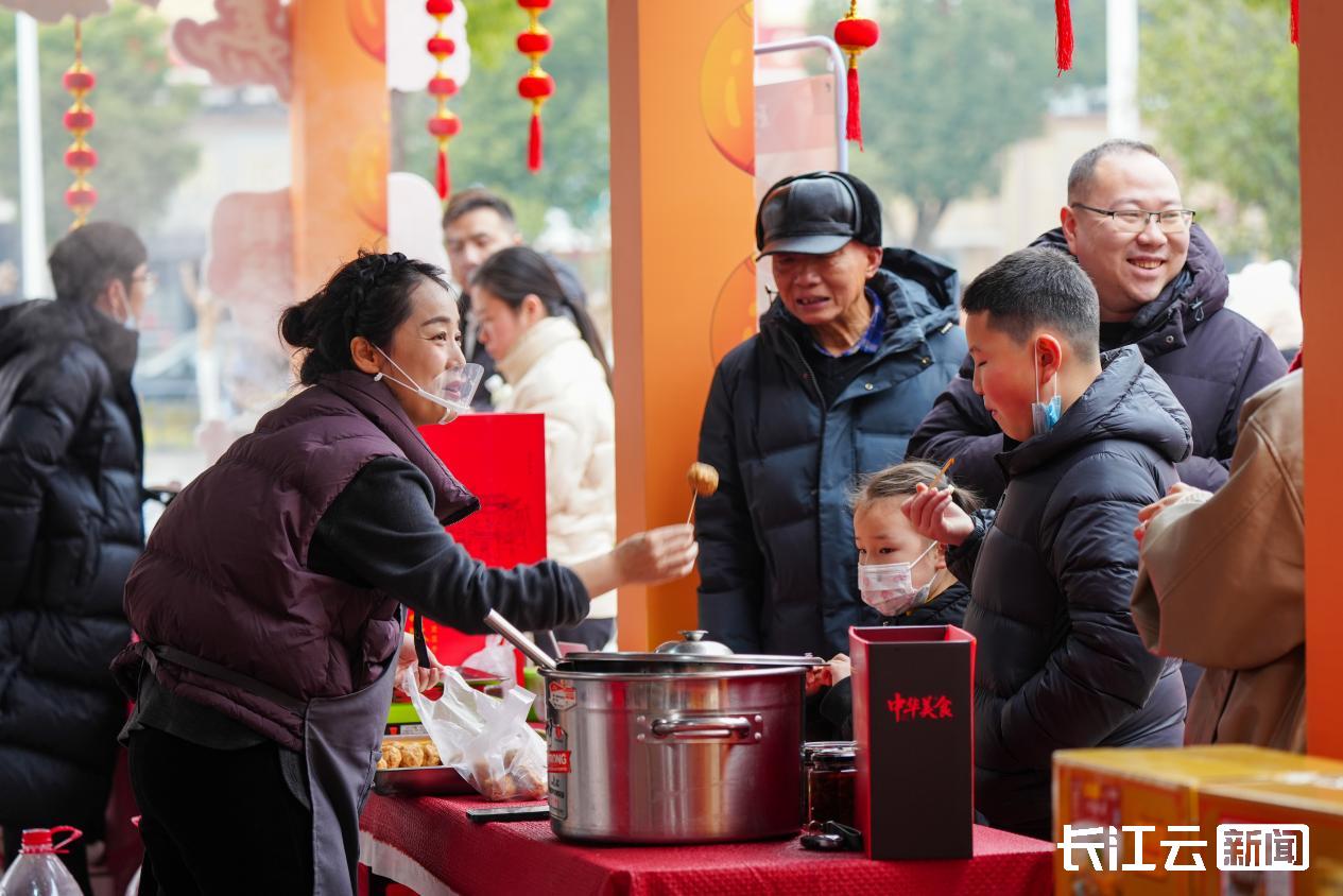 曹祥泰展台热气腾腾,油锅里金黄的圆子滋滋翻滚,市民围站围观,亲眼见证地道年味美食的诞生,还能亲手试炸、现场试吃,暖意十足;打糍粑展台,号子声与石臼的撞击声交织回荡,氛围感拉满;摊豆丝展台,浓郁米香四处飘散,勾起阵阵乡愁。