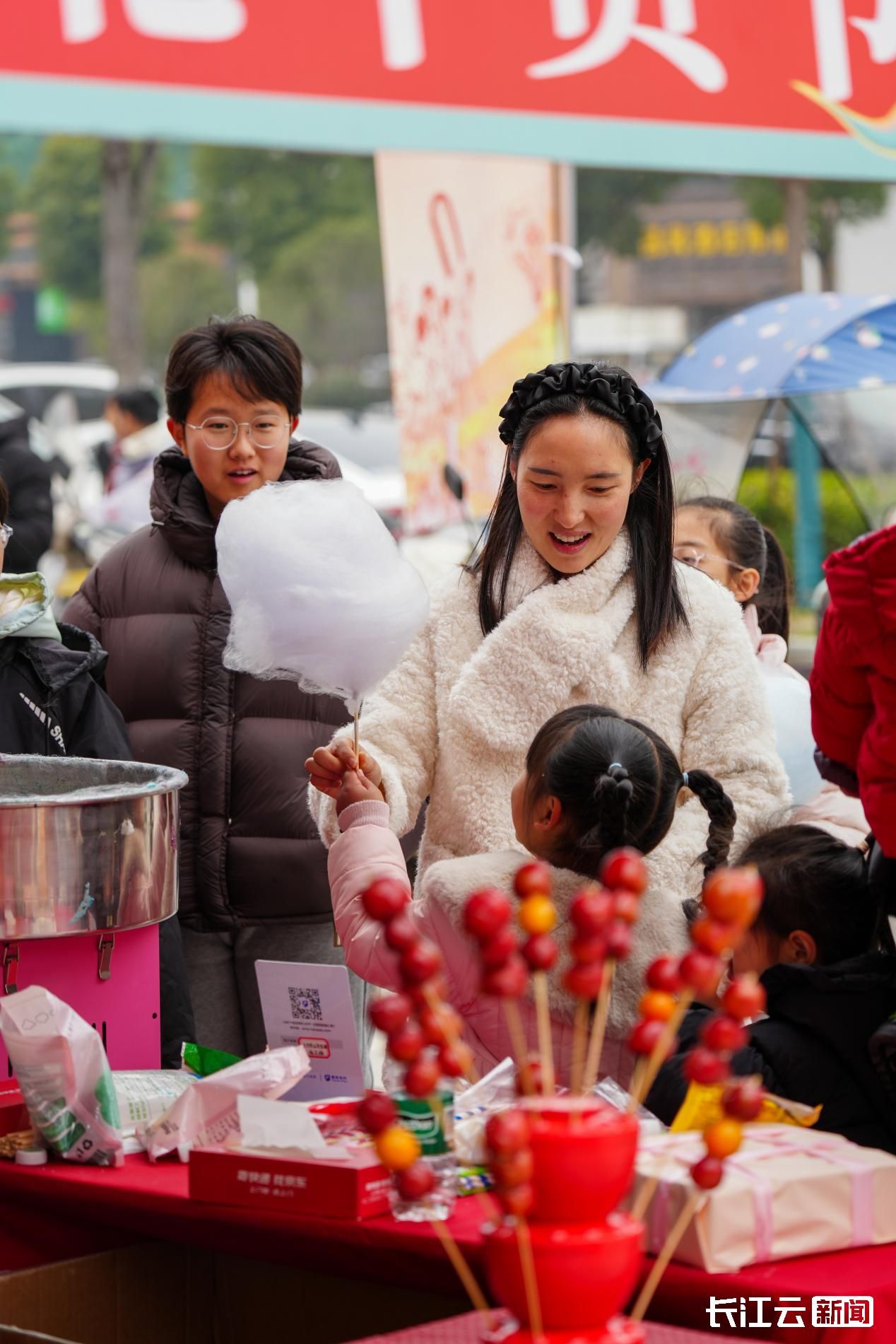 糖葫芦展台前,做了40年糖葫芦的潘师傅守着热锅熬制热糖,边搅动糖稀边耐心引导小朋友亲手自制,欢声笑语不断;棉花糖展台前,香甜气息扑鼻,长长队伍始终不断,大人小孩都盼着拥有一支蓬松软糯的甜蜜。