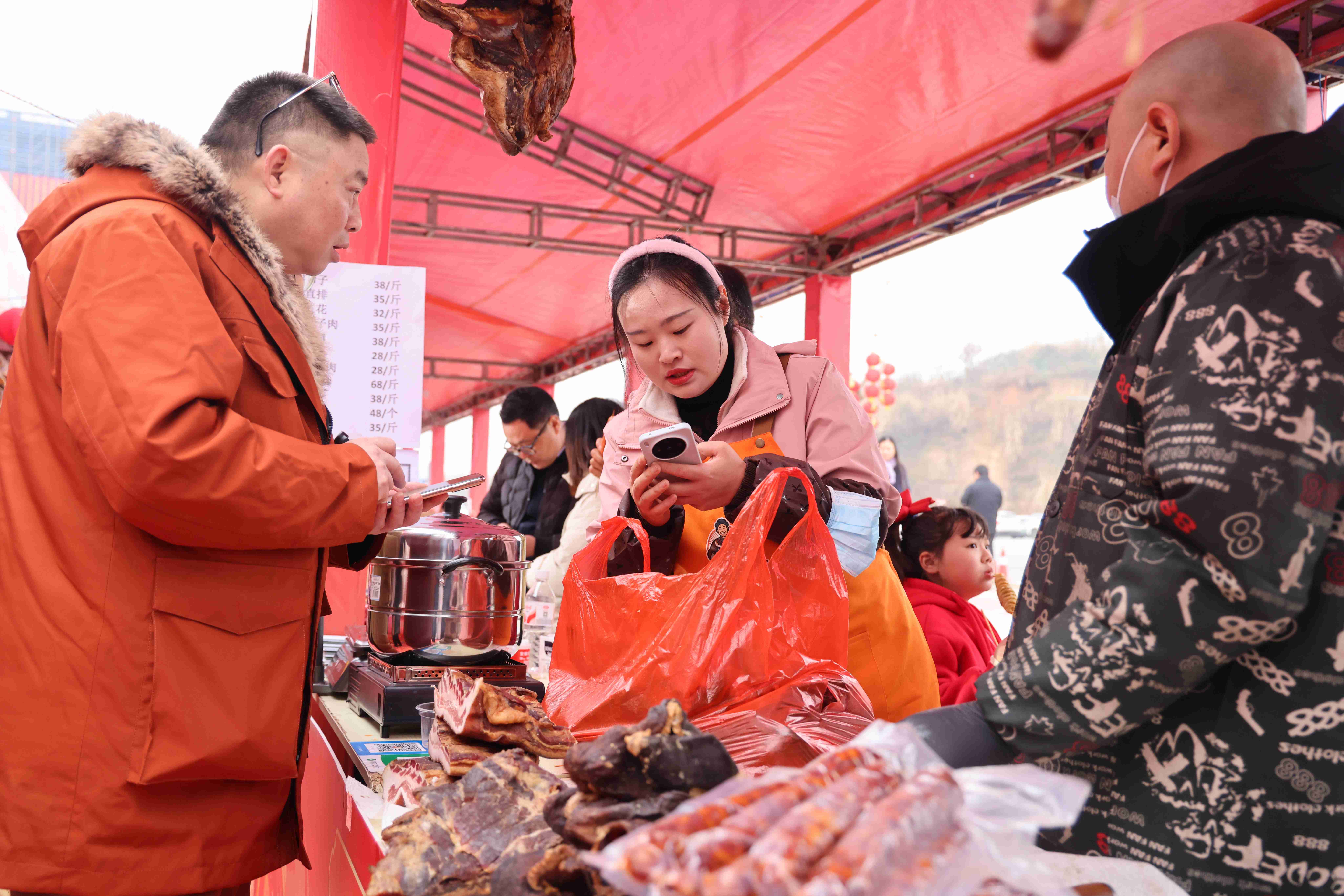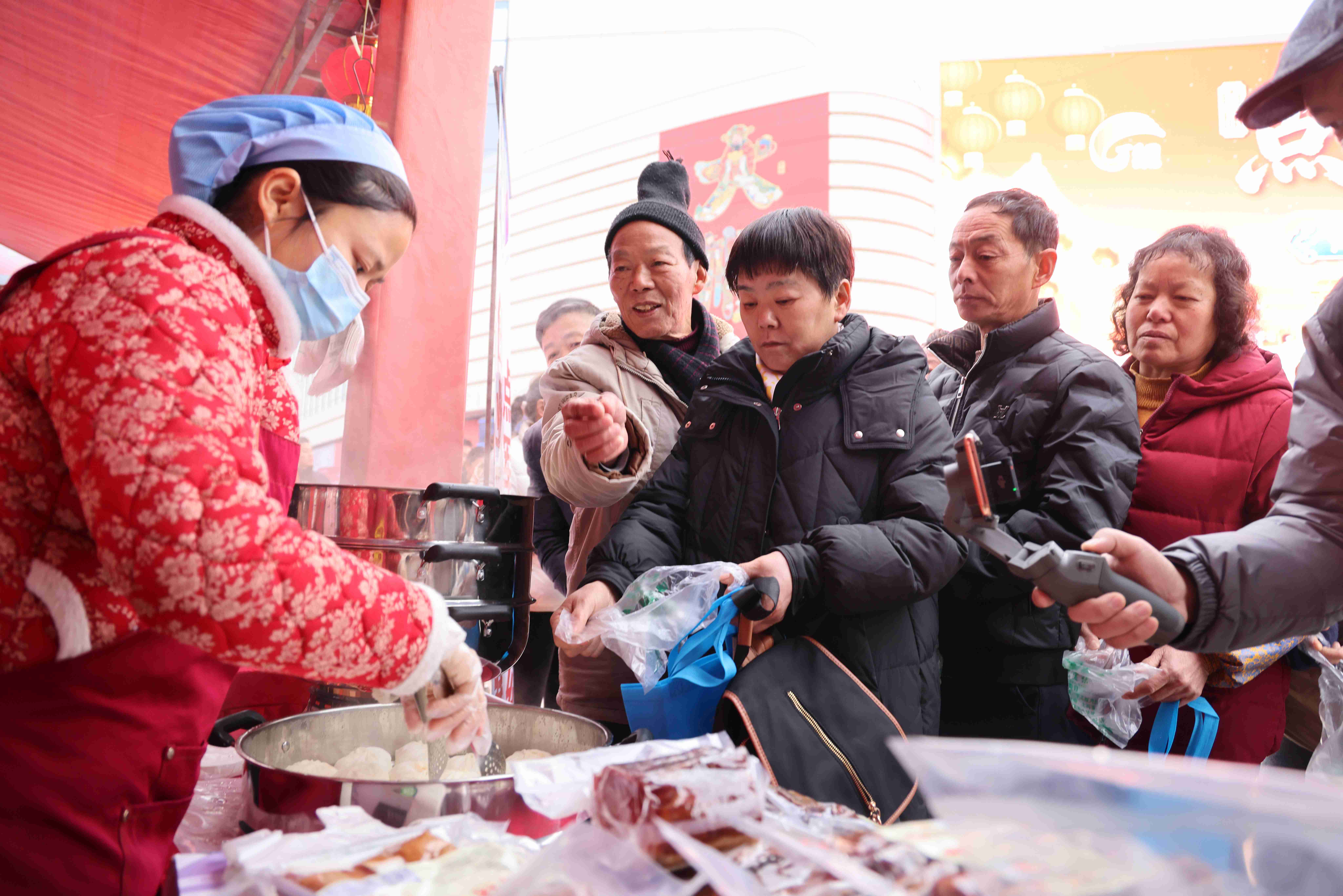 活动现场,七大特色展区全线开放,涵盖传统年货、非遗手作、特色美食、智能家电、家用汽车、户外用品等类别,商品琳琅满目,满足市民一站式购齐年货的需求。美食区尤为热闹,热气腾腾的肥鱼汤、香气四溢的红油包子等上千份特色小吃供市民免费品尝,吸引众多群众驻足,现场人气高涨,购销两旺。