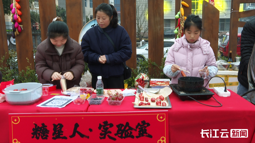 “果香糖甜·串福年”摊位前,邓雯璇小朋友正和家人一起将山楂串在竹签上,晶莹的糖浆在阳光下闪烁。“我要把这份甜蜜分享给同学!”她举着自制的糖葫芦笑道。