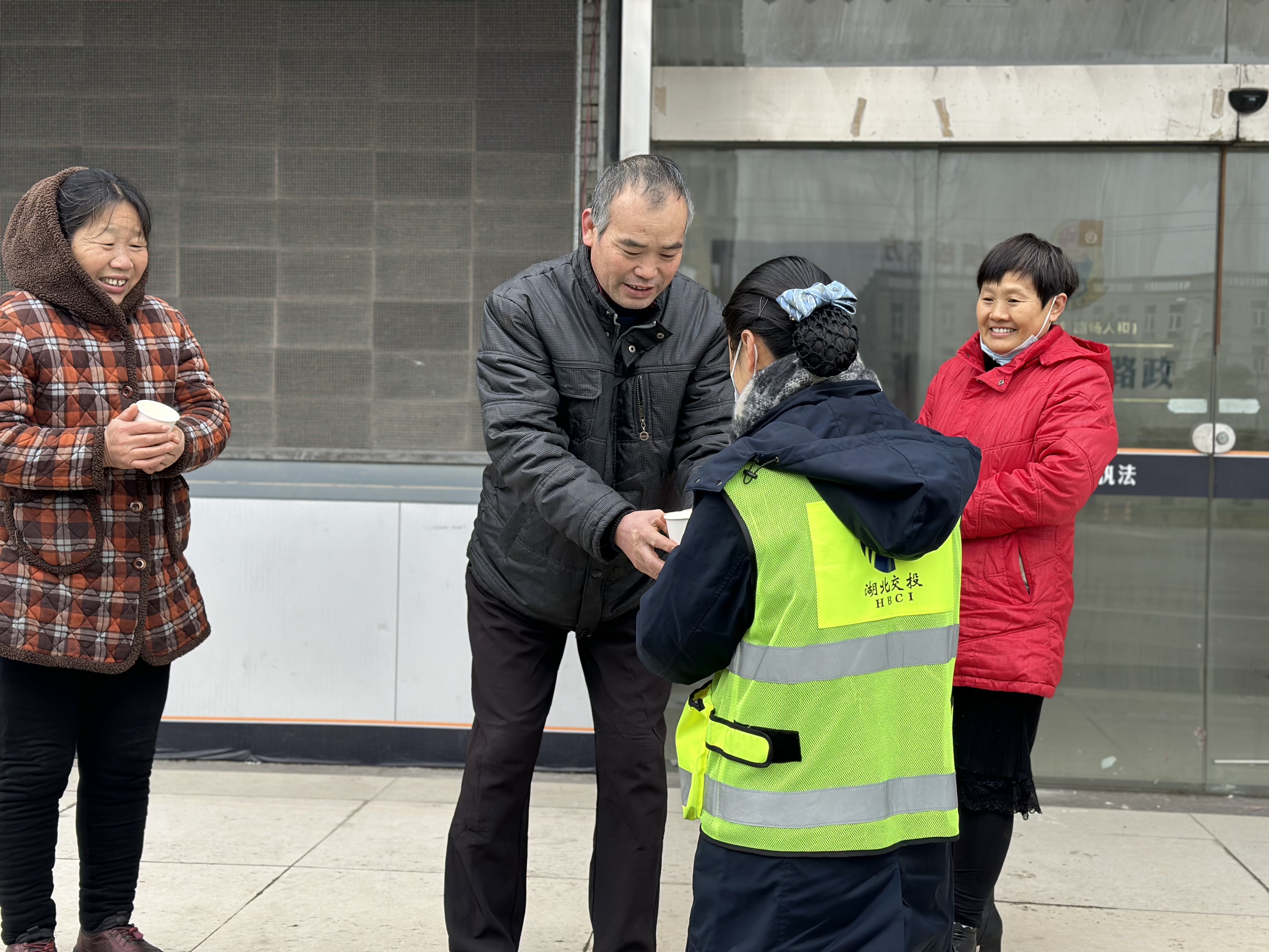 在车辆抢修的15分钟里,“映山红”志愿者为大家送上热水、零食,还贴心解答了后续返乡路段的路况咨询。暖心的服务有效缓解了乘客们的焦虑情绪。