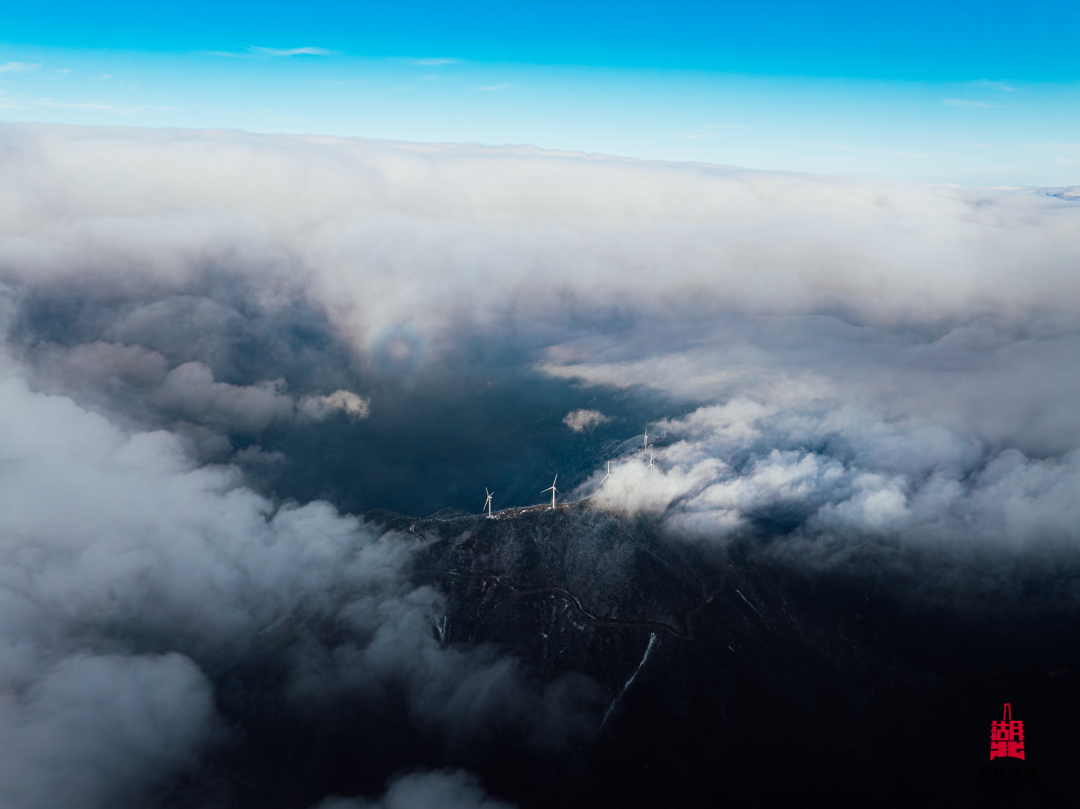 登上海拔1567米的铜鼓包,山下云湖朦胧、山上晴空万里,云海翻腾,巨大的白色风车在云雾中若隐若现。