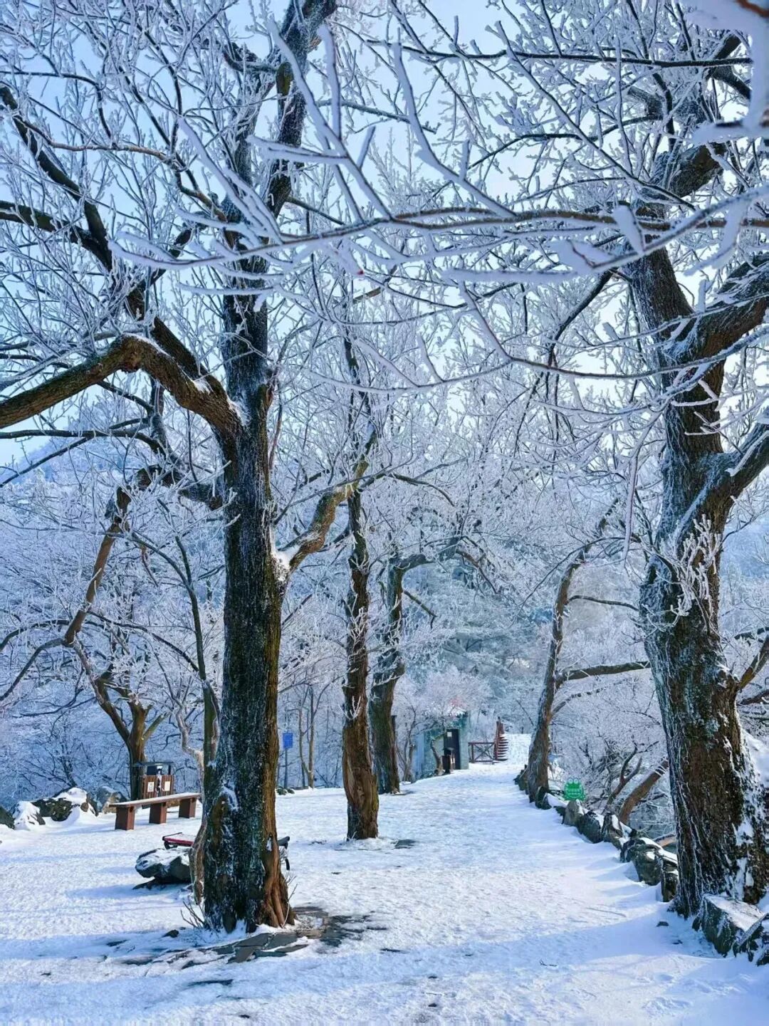 雾气萦绕间,登山石阶湿漉漉地反射着天光,步道两侧树木的枝叶上凝结着细密的雨凇或薄雪,形成“玉树琼枝”的微景观。