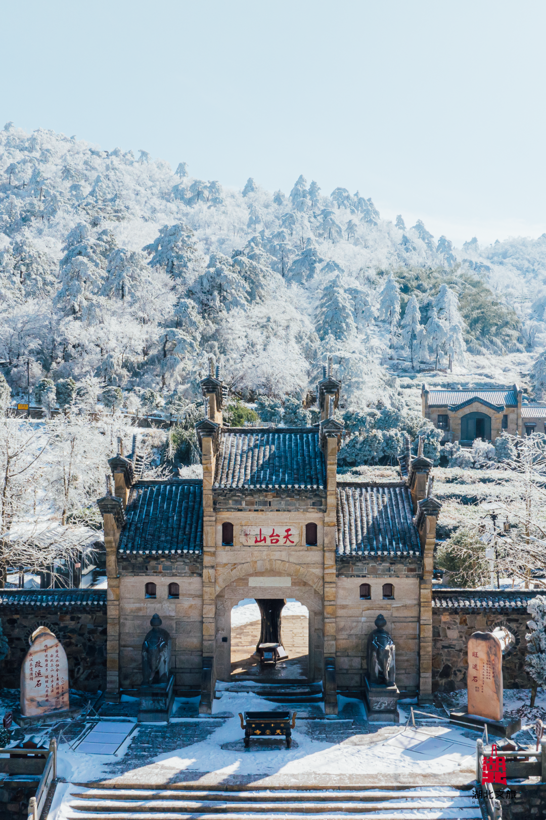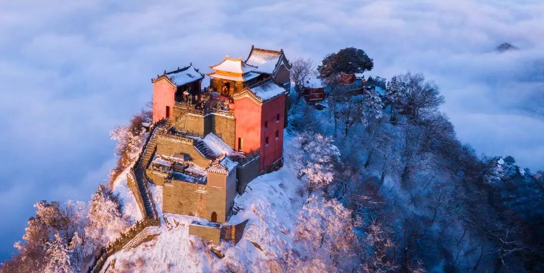 当海拔1612米的天柱峰金顶被新雪覆盖,蜿蜒的神道、朱红的宫墙、玄色的琉璃瓦便在一片皓白中勾勒出静穆的线条,仙山琼阁,一场穿越千年的静默对话就此展开。