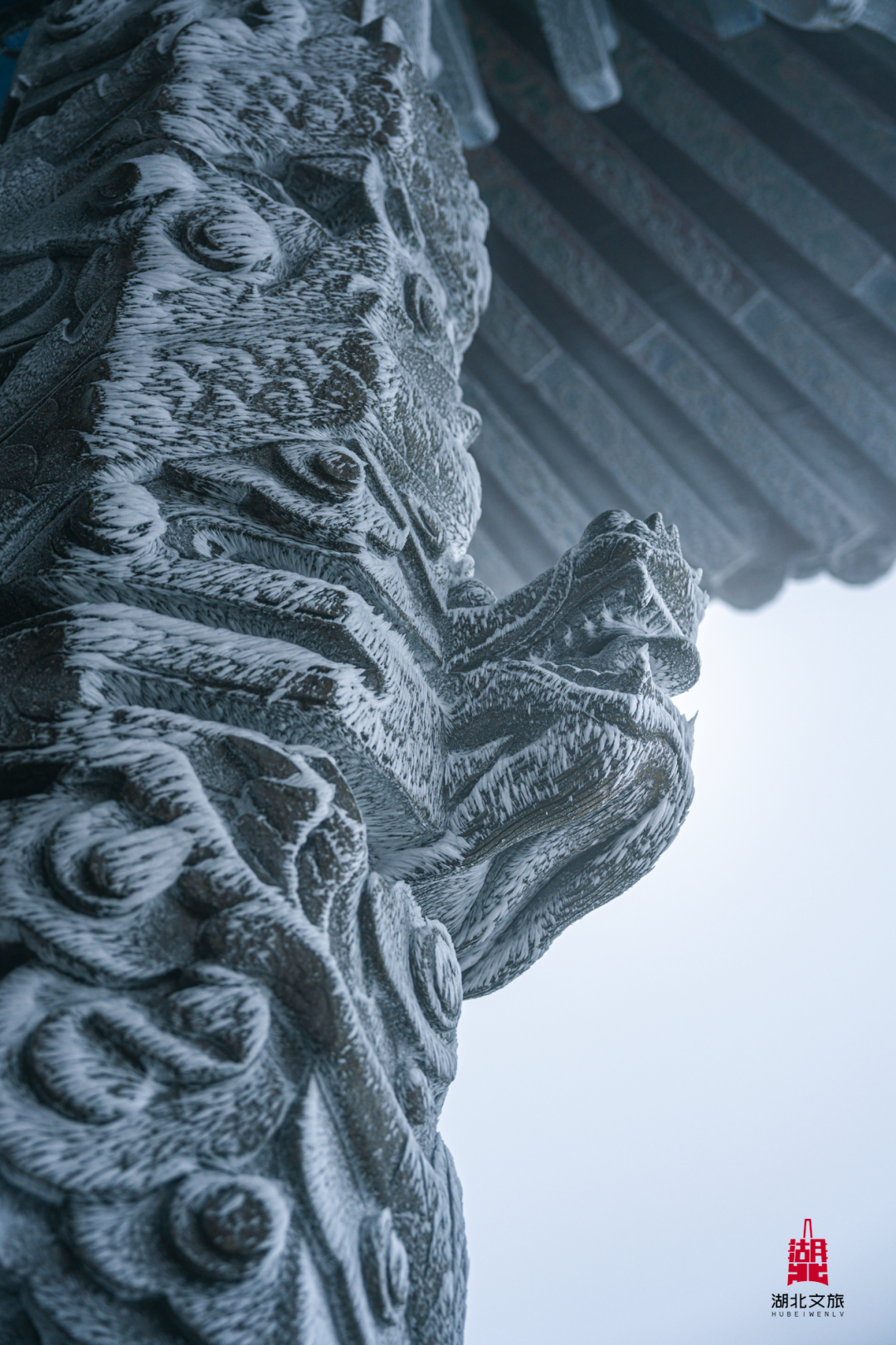 在细雪与薄雾的笼罩下,远近的山峦化为深浅不一的灰色剪影,龙纹石柱被冰晶勾勒出另一种美,朱红色的金顶建筑在茫茫白雾中成为唯一的暖色与焦点,仿佛悬浮于云端的天上宫阙。