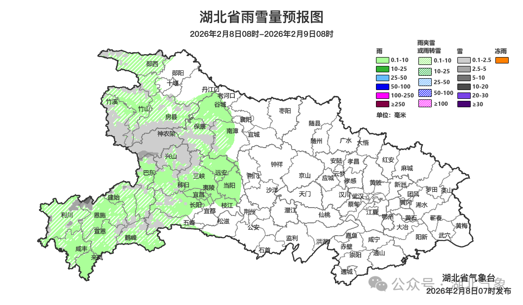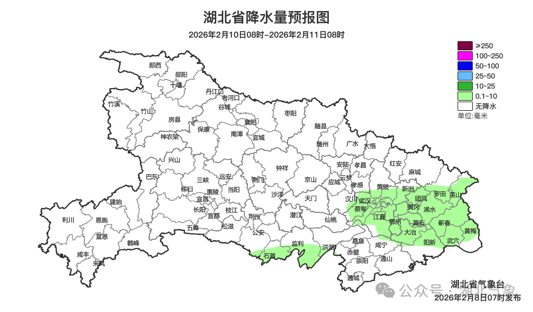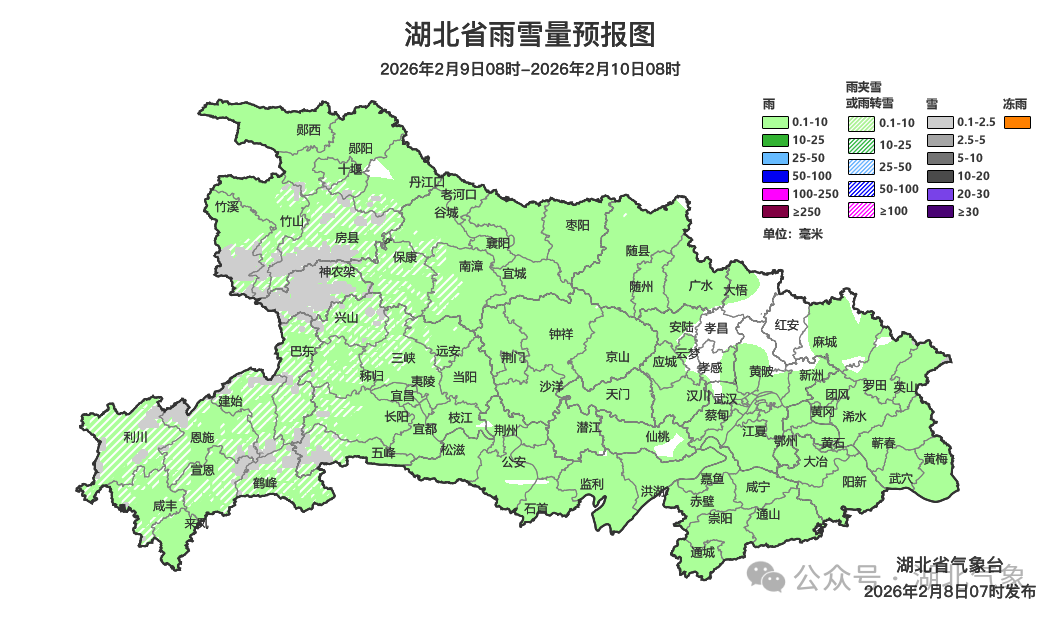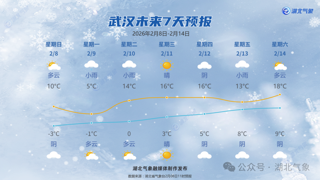 2月9日08时-10日08时,全省阴天有小雨,其中鄂西中高山区有雨夹雪或雪。最高气温西部6~12℃、中东部4~6℃,最低气温北部-2~1℃、南部1~3℃,偏南风2到3级。