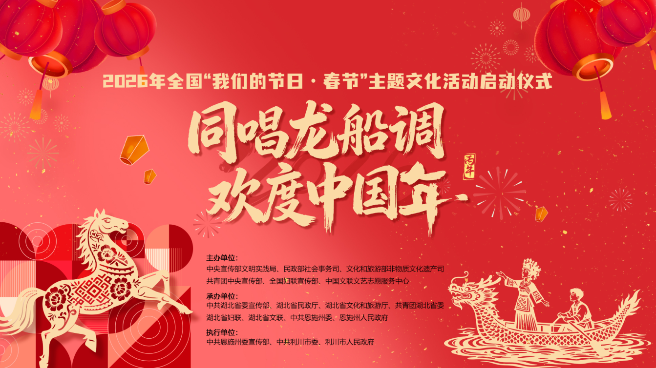 同唱龙船调·欢度中国年——2026年全国“我们的节日·春节”主题文化活动启动仪式将于2月10日19:00在利川市滨江北路清风明月广场举办。届时,深度融合马年元素与本土特色文艺类节目精彩上演,全方位打造兼具观赏性、参与感与惠民性的开篇盛会。