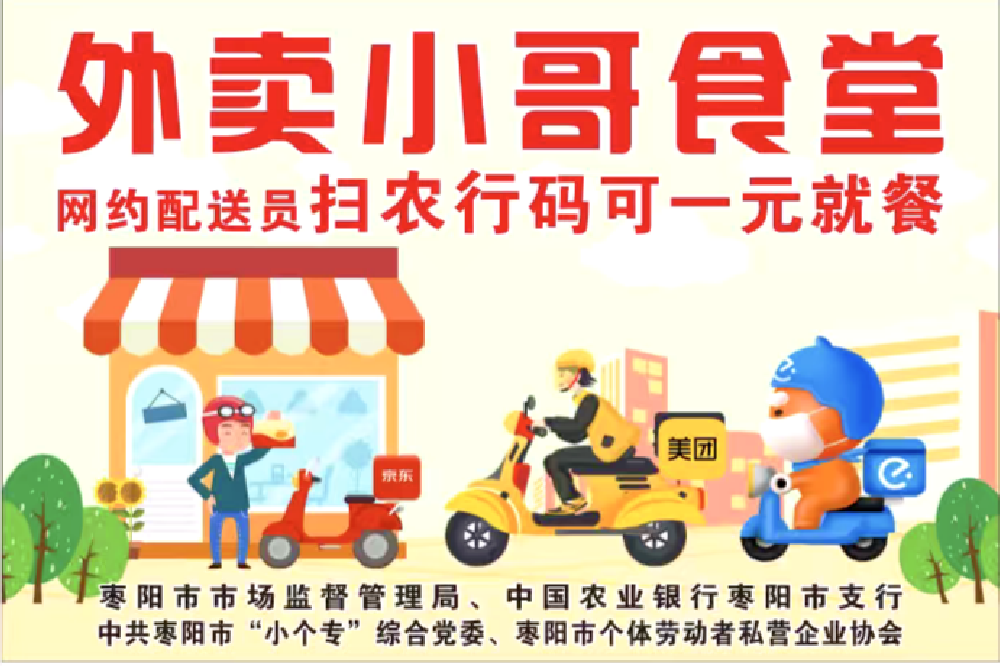 “就餐难、歇脚难、补给难”,是新就业形态网约配送员群体普遍面临的痛点。为破解这一难题,枣阳市市场监管局、市“小个专”综合党委、市个私协会联合中国农业银行枣阳市支行,创新推出“外卖小哥食堂”共建项目,以多方联动的服务模式,为新就业群体撑起“暖心港湾”。
