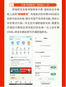 即插即充充电流程简单方便,插枪后在充电桩上选择“即插即充”,充电桩识别车辆vin码成功后即可启动充电(部分车型不支持该功能,具体以实际情况为准)。车主在开通即插即充前,需要先开通后付费和在快充桩扫码充电一次上送车辆vin码,绑定车辆后即可开通即插即充。