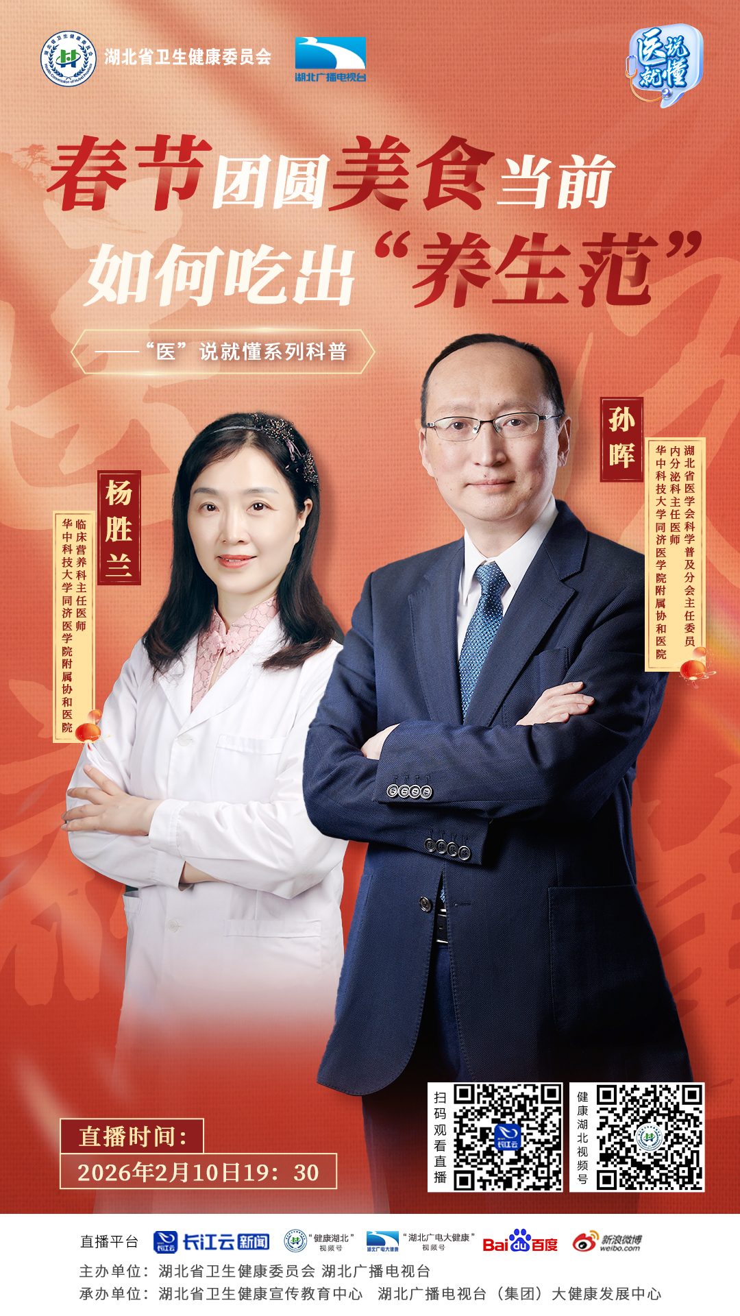 2月10日19:30,湖北省卫生健康委员会联合湖北广播电视台带来《“医”说就懂》系列科普直播《春节团圆美食当前 如何吃出“养生范”》,华中科技大学同济医学院附属协和医院内分泌科主任医师、湖北省医学会科学普及分会主任委员孙晖,华中科技大学同济医学院附属协和医院临床营养科主任医师杨胜兰,将一同带你解锁“吃不胖、甜咸有度”的健康密码,过个轻盈好年!