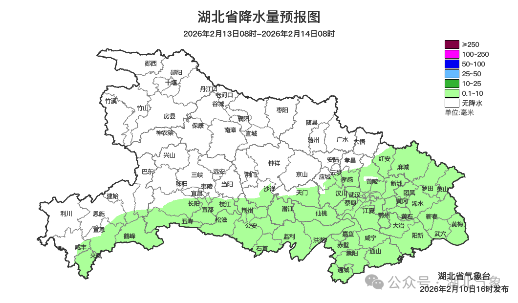 2月13日08时-14日08时,鄂西南南部、江汉平原南部、鄂东北东部、鄂东南阴天有小雨;其他地区阴天到多云。最高气温鄂西北18~21℃、其他地区13~18℃,最低气温西部3~7℃、中东部7~11℃,偏南风2到3级。