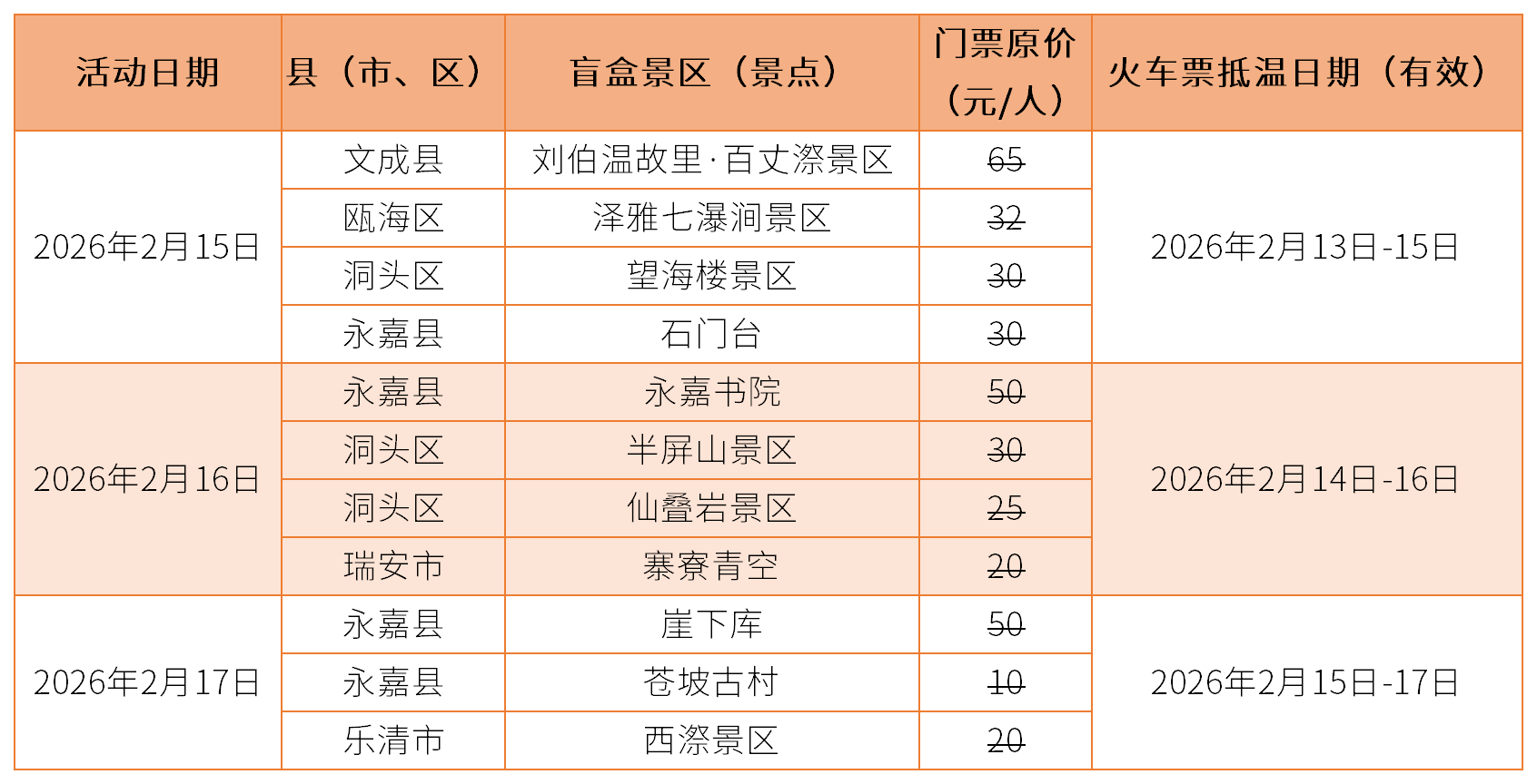浙江省温州市推出火车票免费游景区盲盒计划,共计30个景区(景点)参与活动。免费景区采用盲盒逐期公布形式,每次官宣未来3天免费景区名单,凭有效火车票即可免首道门票入园。第二批盲盒景区公布时间,2026年2月15日。