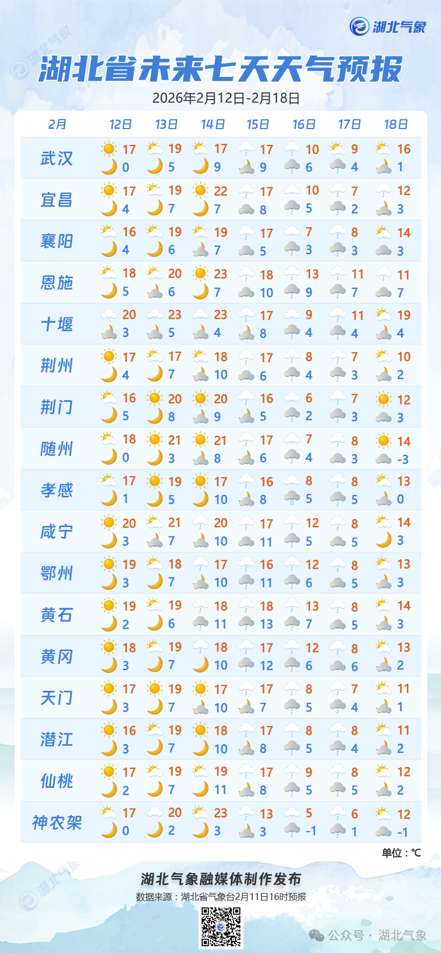 2月13日08时-14日08时,鄂东南多云,局地有短时小雨;其他地区晴天到多云。最高气温17~22℃,最低气温西部3~6℃、中东部6~10℃,偏南风2到3级。
