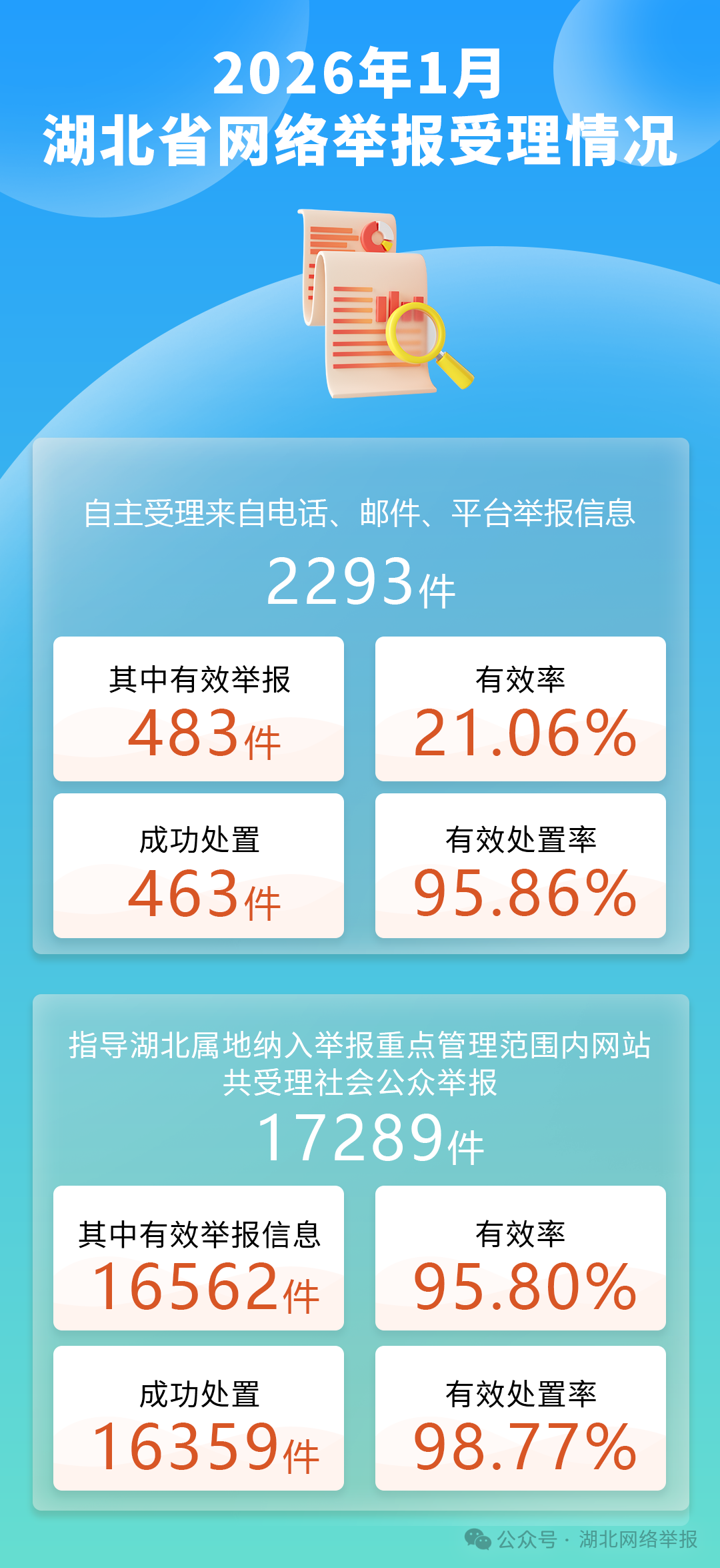 2026年1月份,湖北省互联网违法和不良信息举报中心自主受理来自电话、邮件、平台举报信息2293件,其中有效举报483件,有效率21.06%;成功处置463件,有效处置率95.86%。