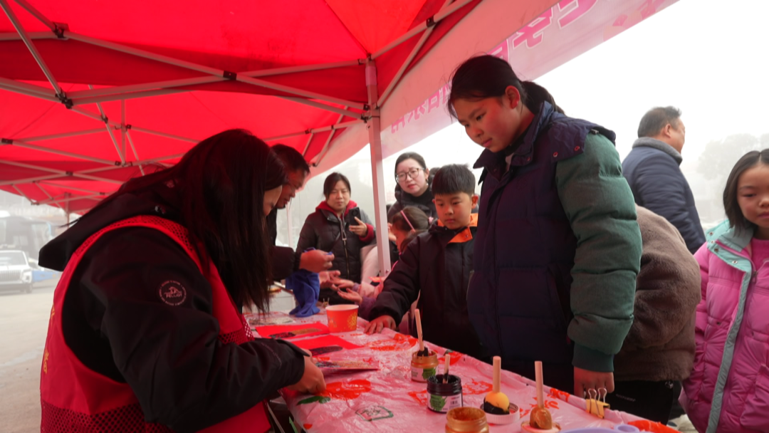 舞台一旁的各展位也是热闹非凡。在“春联送福区”,书法家们挥毫泼墨,一副副寓意吉祥的春联墨迹未干便被热情等候的村民争相领取。“非遗剪纸区”里,志愿者指导孩子们体验拓印红包、剪纸的乐趣。“美食体验区”更是热气升腾,村民吆喝着打糍粑,欢声笑语间洋溢着浓浓的年味。