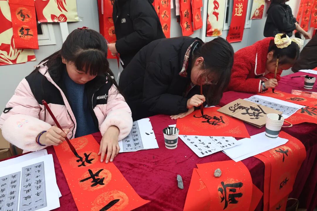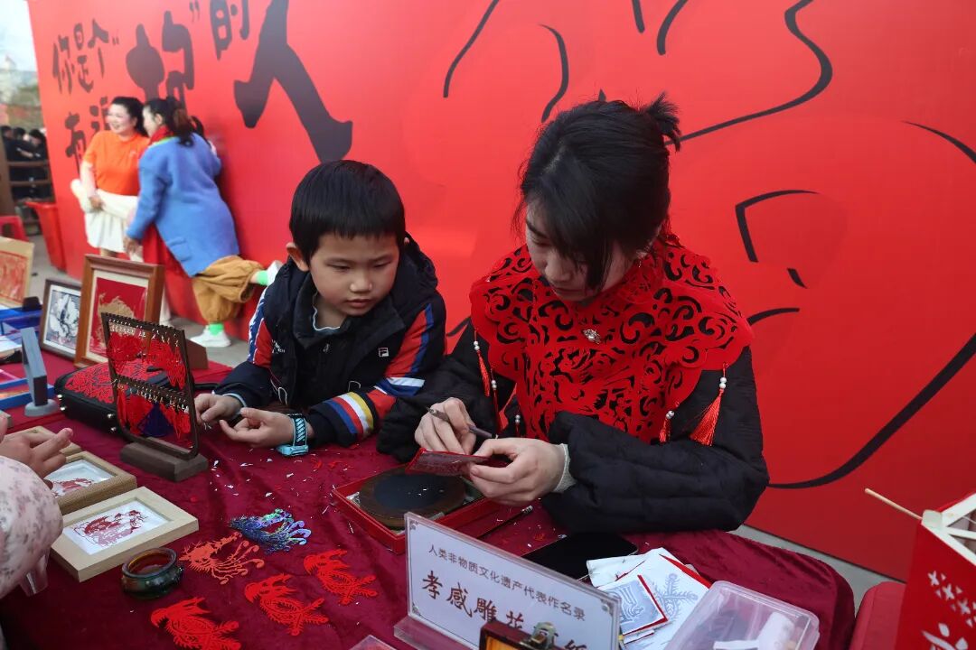民俗街区灯笼高悬,八仙桌美食区香气扑鼻,舞狮、采莲船巡演轮番上演,孝感雕花剪纸、麦秆画等非遗项目展示引得市民、小朋友驻足体验。年味市集上,春联书写、传统年货、特色小吃摊位错落有致,孝感麻糖、米酒、炒货等美食香气四溢,勾起了大家的味蕾。