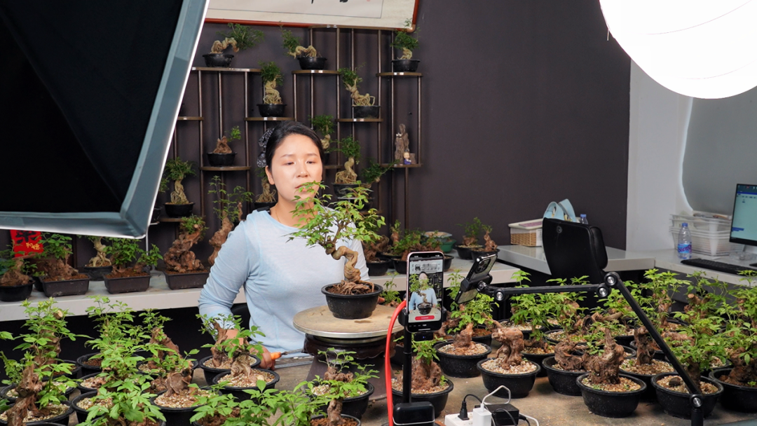 从最初几千盆的线下零散销售,到2025年试水抖音、视频号直播带货,短短两年时间,基地的小微盆景规模已达15万盆,年销售额突破70万元,实现了从“遇冷”到“爆红”的逆袭。