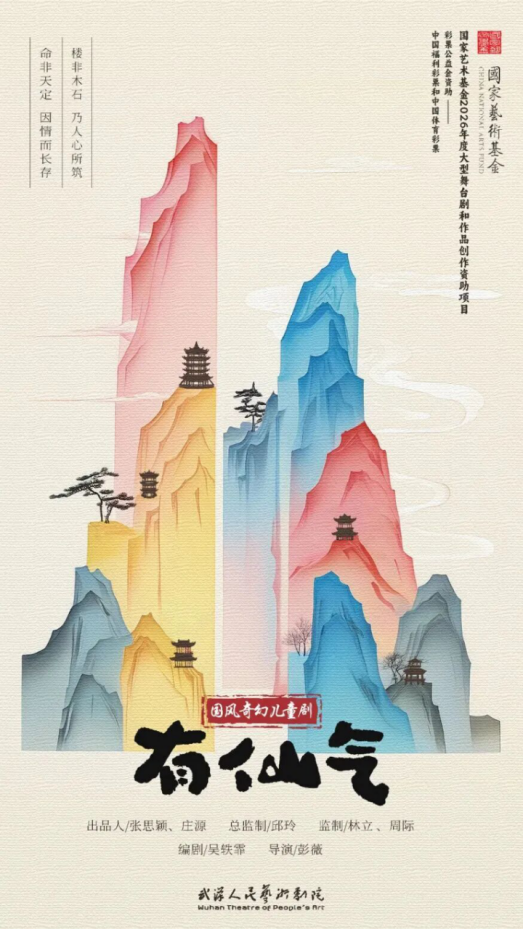 儿童剧《有仙气》以武汉地标黄鹤楼为文化背景,创新运用轻量化舞美、光影技术与东方写意美学融合的艺术形式,突破传统儿童剧视觉边界,巧妙融入“橘皮画鹤”“仙人乘鹤”等黄鹤楼传说,串联起楼体“起源、毁灭、重生”的千年脉络。