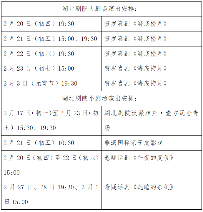 同时,春节期间湖北剧院大剧场、小剧场将配合丰富的剧场演出:
