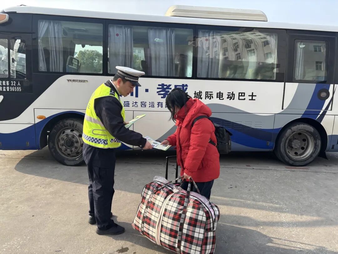 随着春运拉开帷幕,为保障节日期间道路交通安全有序、预防和减少交通事故,孝感市公安局交警支队直属一大队近日组织警力,深入辖区客运站、公交公司等重点运输企业,全面启动春运交通安全宣传与安全检查专项行动,用心守护群众的平安返乡路。