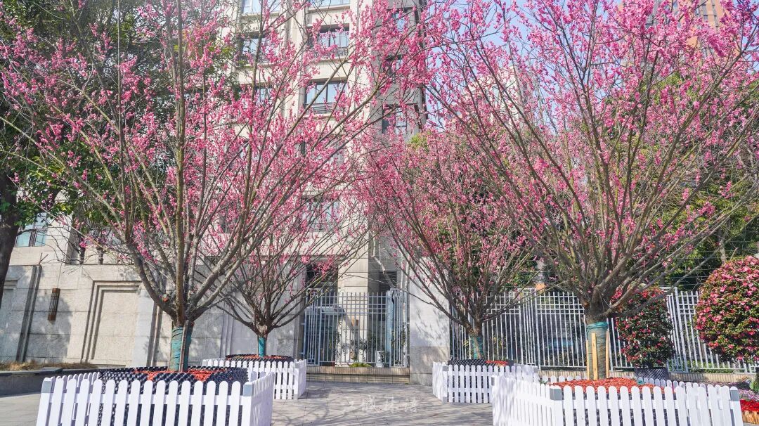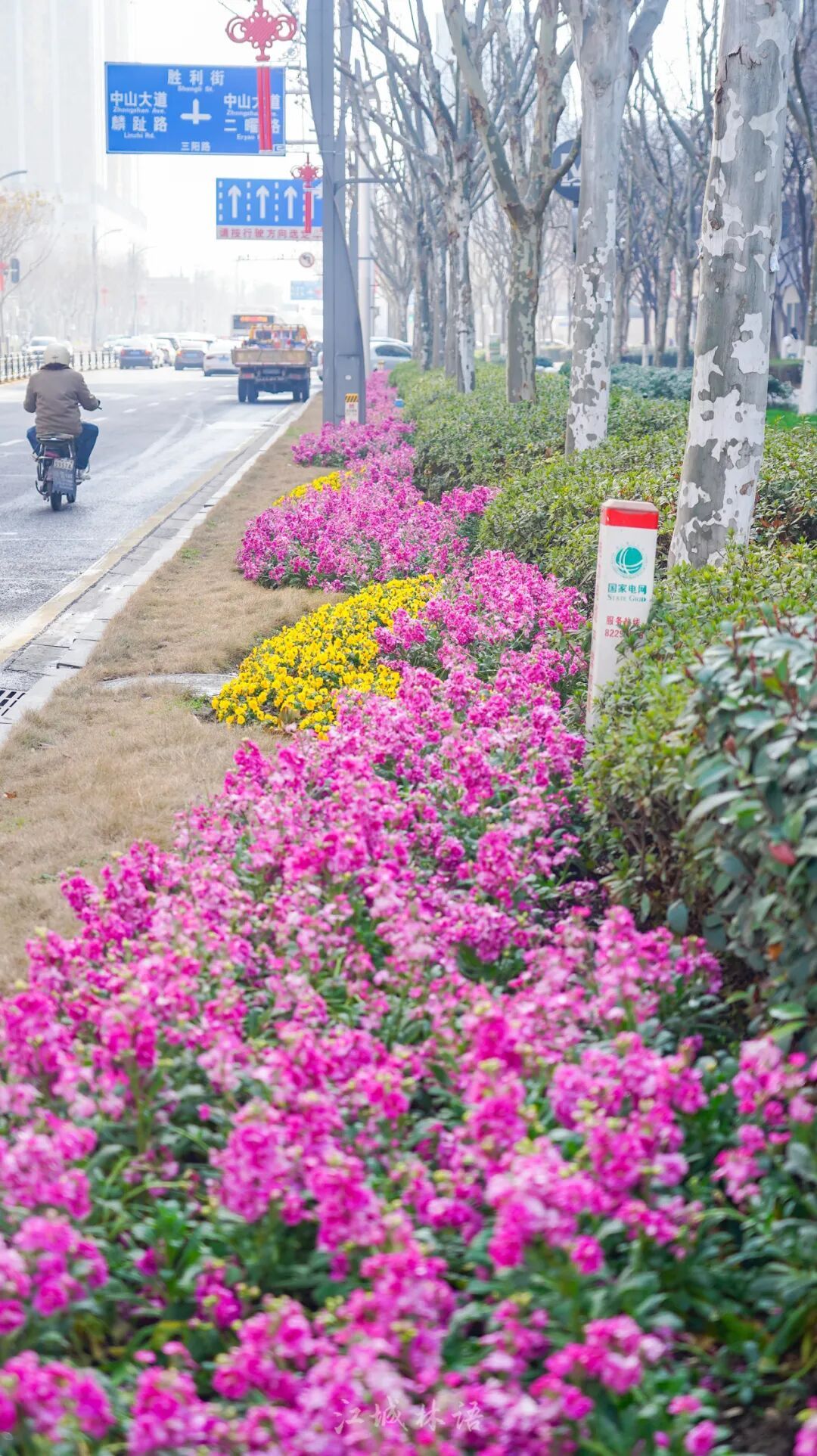 梅花点缀街头的同时,“时花换装”同步进行。目前,全市16个城区(功能区)的60余条主干道及重要节点,纷纷以时令花卉“描眉画鬓”。