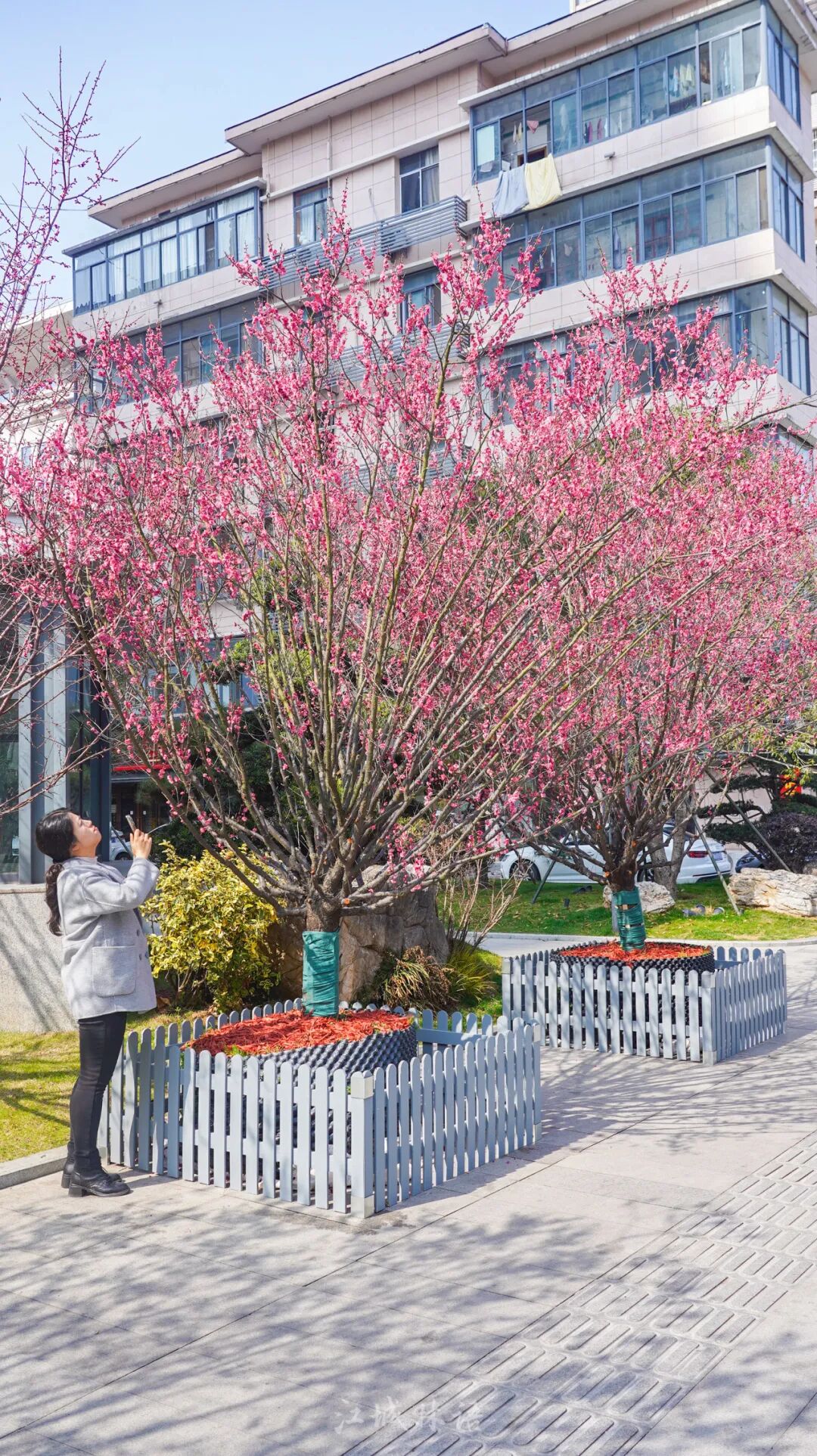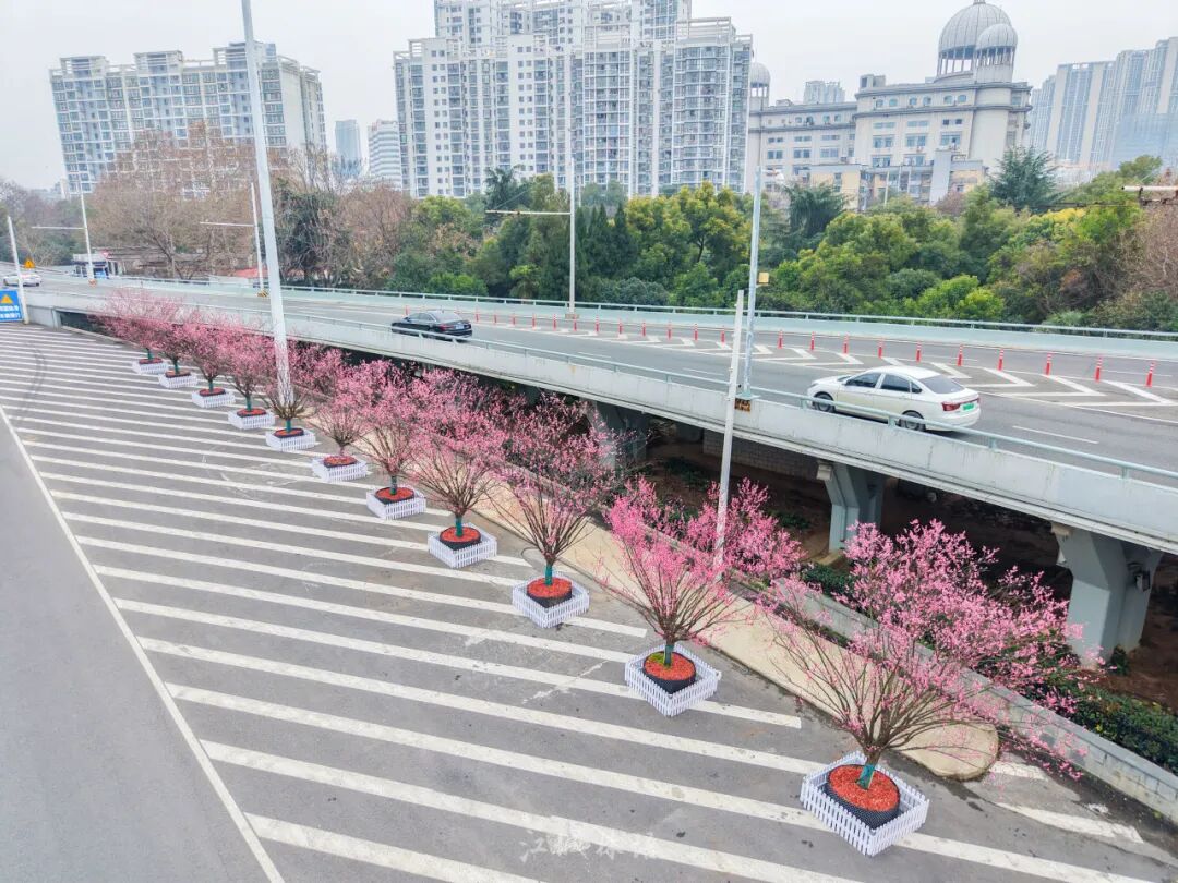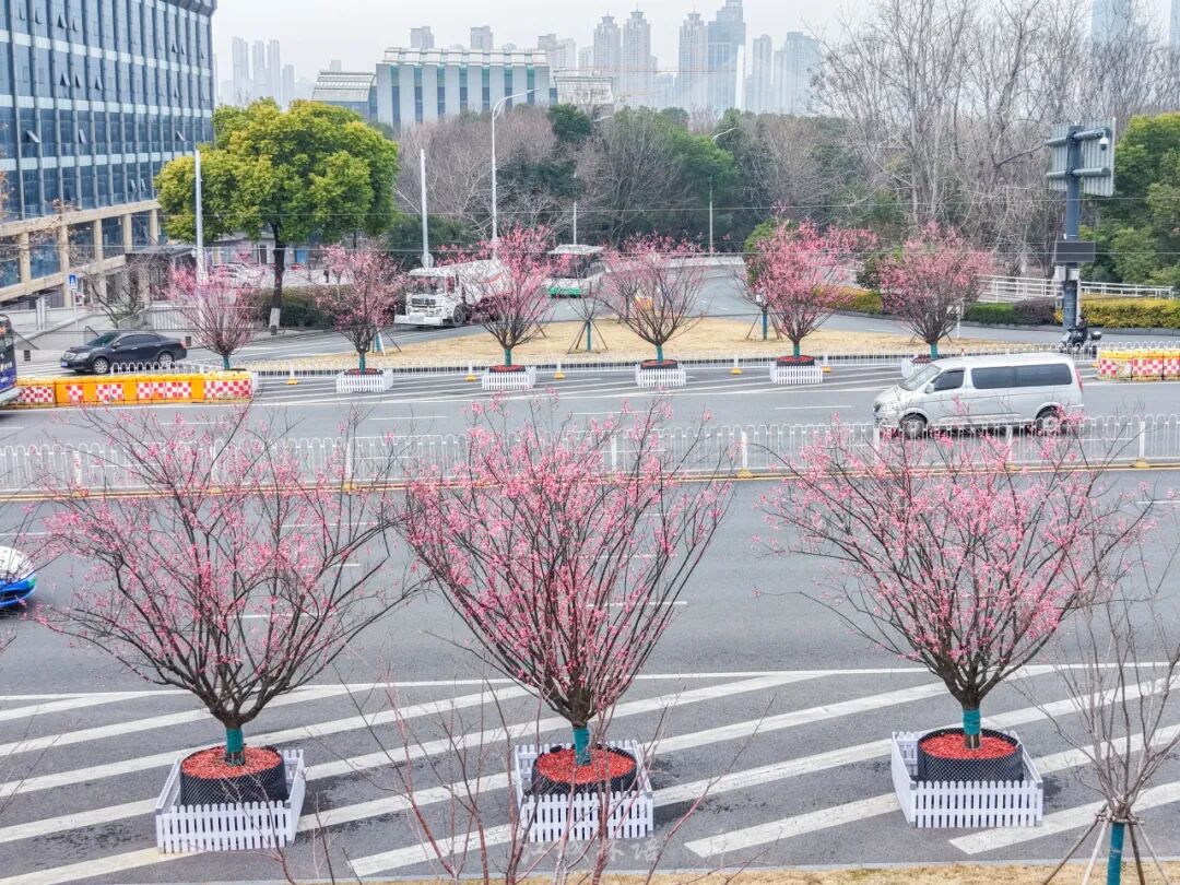 所谓“快闪”,妙在其“来去自如”。这些梅花均来自东西湖区柏泉苗圃的容器苗,在苗圃中精心养护至含苞待放,再连夜运抵街头“闪亮登场”,能迅速营造出“忽然一夜清香发,散作乾坤万里春”的意境。待花期过后,它们将“功成身退”,返回苗圃“休养生息”,待来年再度绽放。这种突破固定栽种模式、可移动循环的布景方式,体现了现代园林艺术的巧思与低碳理念。