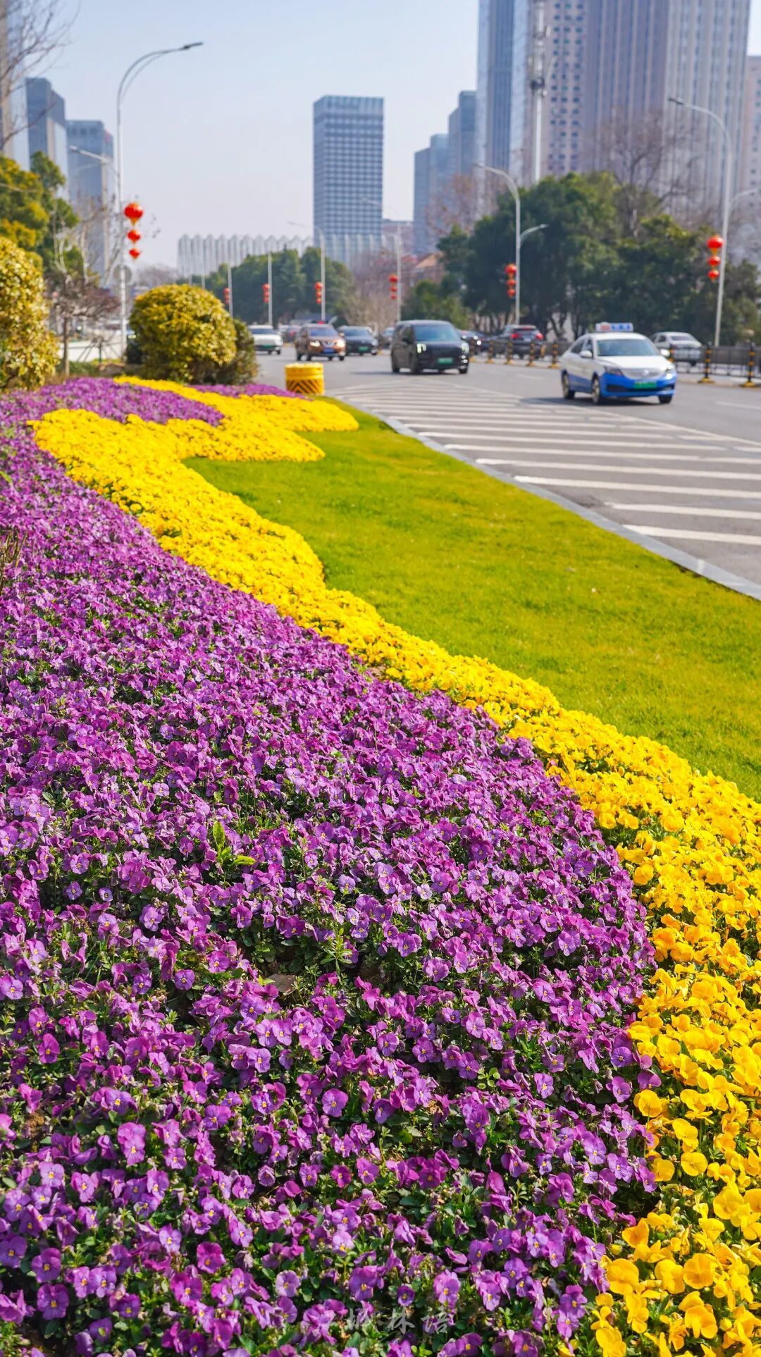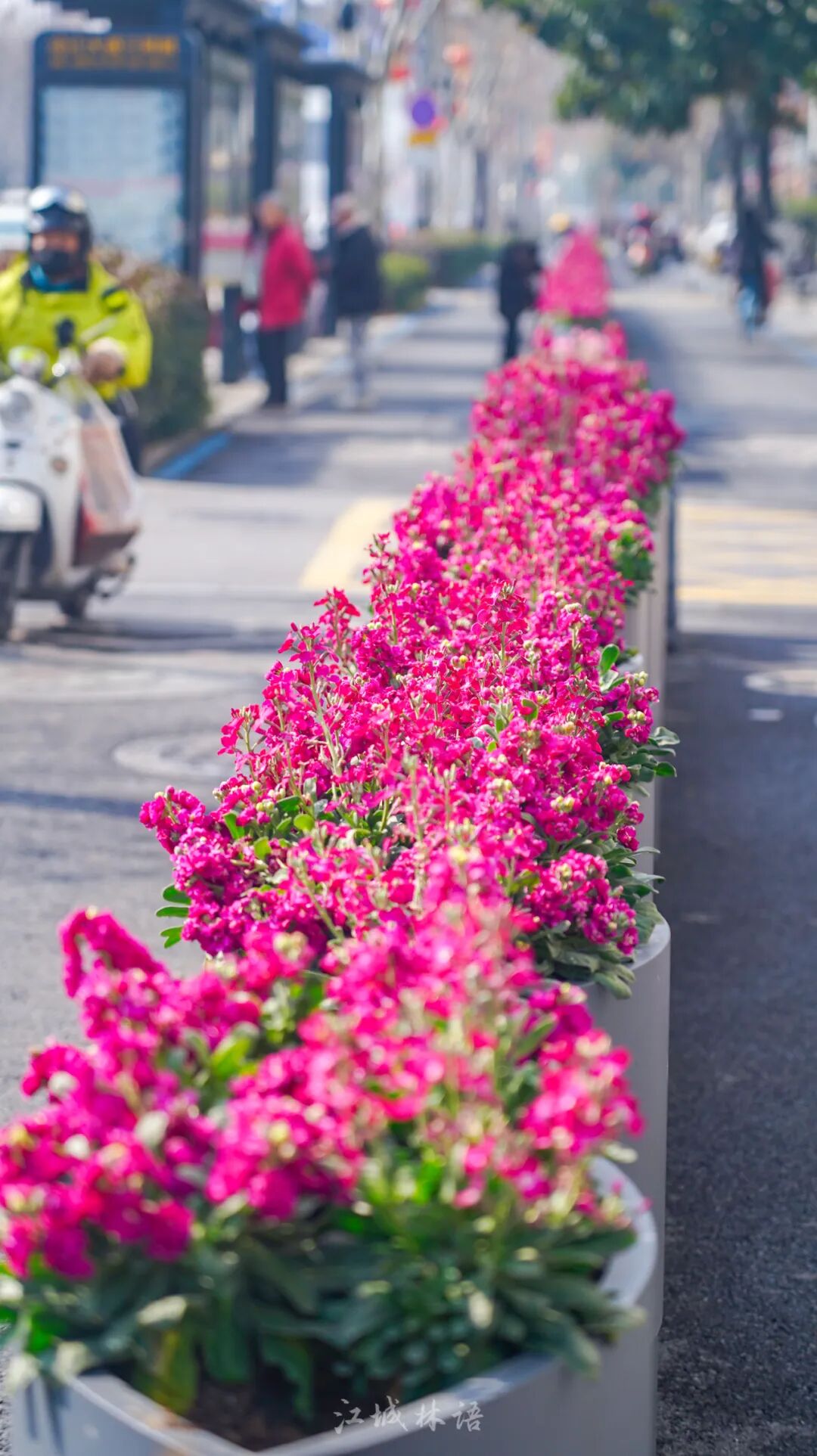 在汉口沿江大道,长江二桥至江汉路段的鱼纹花箱内,粉红色的紫罗兰与明黄的角堇交织,形成一条长达4公里的绚烂“花溪”,沿路奔流。换装后的三阳路沿线花坛,则变身立体“垂江花廊”,春意盎然。市绿化服务中心养护科科长万奕表示,所选花卉花期可持续至春节后,实现与自然春花“无缝对接”。