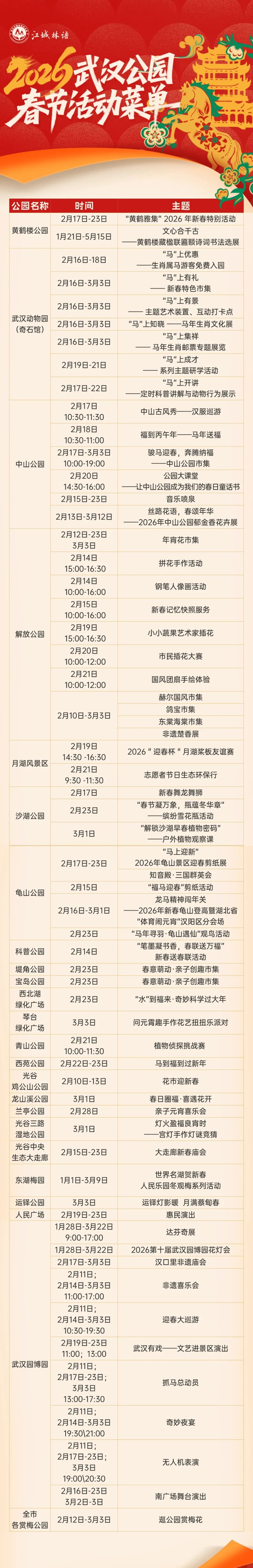 春节期间,黄鹤楼公园“黄鹤雅集”将带来沉浸式年味体验;武汉动物园结合马年主题,设置艺术装置并举办生肖、邮票文化展;中山公园郁金香展布展就绪,将免费开放;解放公园有将组织市民插花比赛与手作活动;武汉园博园题材丰富的花灯会,更是璀璨夺目……市民与游客在赏梅之余,可尽享传统与时尚交融的节日乐趣。