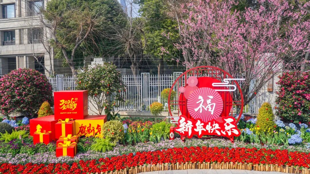 今年,一抹灵动飘逸的“中国红”尤为亮眼——百余株“快闪梅花”首次上街布景,与各具特色的时令花卉、匠心独运的园林小景交织辉映,共同绘就“湿地花城”红火祥和的春节画卷。